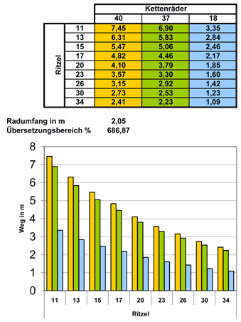 De facto bleiben von den 27 theoretischen Gängen 14 nutzbare Gänge übrig. 13 Übersetzungsabstufungen, und damit Gänge, sind doppelt vorhanden. Die Gangsprünge liegen im Durchschnitt bei 15 %. Durchtrainierten Sportlern mögen diese Gangsprünge ausreichend fein gestuft sein, weniger Trainierte und Reiseradler mit vollem Gepäck sind dankbar, wenn sie, z. B. am sich drehenden Wind an mäandernden Flußläufen, welligem Gelände oder unterschiedlichem Fahrbahnuntergrund mittels eines fein gestuften Getriebes immer im optimalen Drehzahl- und Belastungsbereich fahren können.