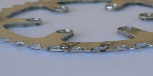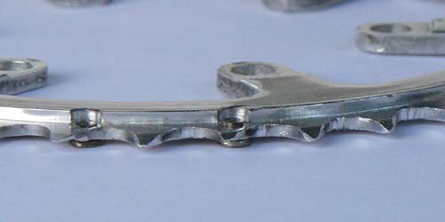 Eigentlich reicht pro Totpunkt eine Steighilfe, hier sind aus Gründen der Redundanz zwei angebracht. Wenn die Steighilfen sitzen, werden die Schaltgassen in das Kettenblatt gefeilt und die auf die Steighilfen folgenden drei Zähne auf der Außenseite angefast. Dadurch können die Laschen der Kette besser über die Zähne gleiten. Außerdem werden diese drei Zähne haifischrückenflossenförmig angefeilt (wie auf dem Abbild des kleinen Kettenblattes gut zu erkennen). Dadurch können die Kettenrollen leichter ins Bett gleiten.