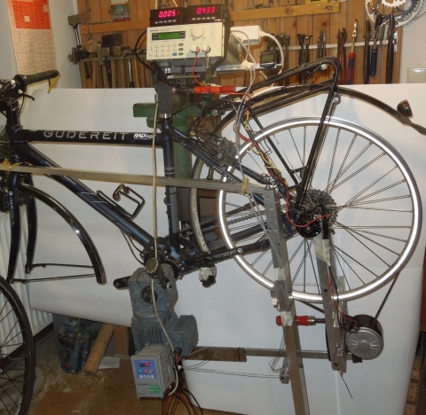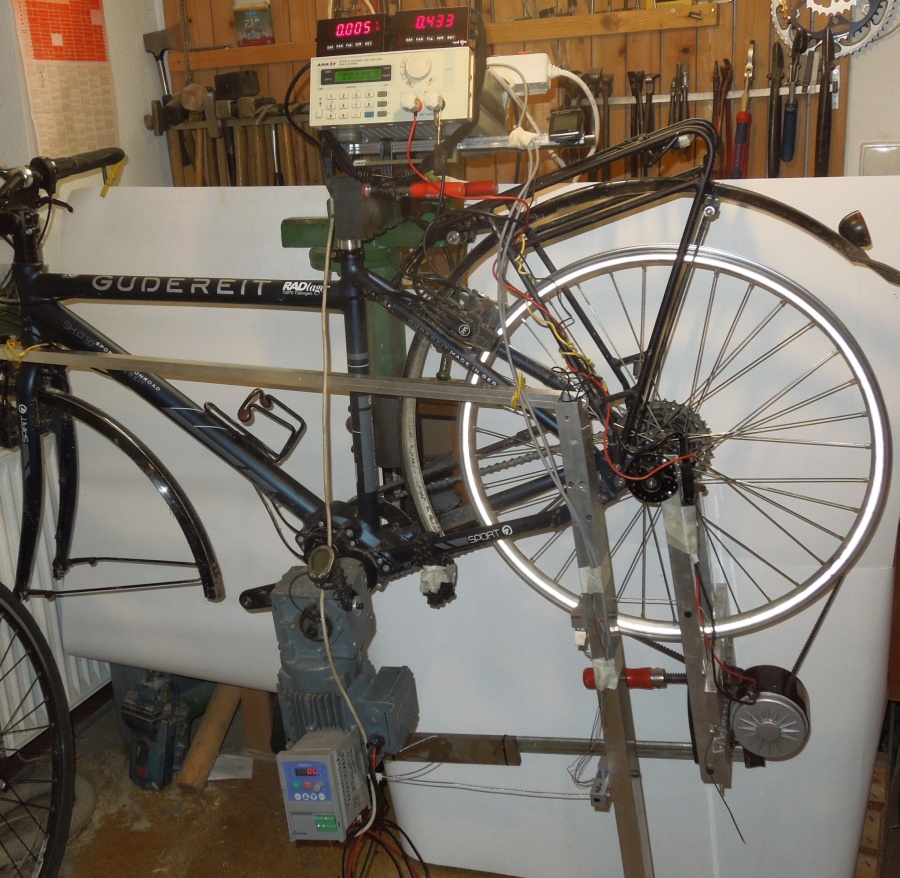 Der Nabenschaltungs-Prüfstand, den ich in Fahrradzukunft 16 und 17 vorgestellt habe, war für die P1.18 nicht direkt nutzbar, weil dieses Tretlagergetriebe eben eine spezielle Aufnahme am Rahmen verlangt. Freundlicherweise gestattete mir Jörg Wulle, ADFC Vorstand in Tübingen, einige Wochen sein etwa ein Jahr intensiv gefahrenes Gudereit SX-P1.0 Trekkingrad mit P1.18 für Messzwecke umzubauen. Dazu musste der Getriebemotor an die speziellen Pinion-Kurbeln und die Tretlagerwelle angepasst und ein Rohr am Hinterbau befestigt werden, an dem sich die Bowdenzüge für die Kraftmessung abstützen. Als Hinterrad kam das schon im alten Prüfstand genutzte 26 Zoll Kettenschaltungs-Rad zum Einsatz. So konnte nun vergleichbar wie in den beiden vorherigen Artikeln Drehzahl und Drehmoment an An- und Abtrieb gemessen werden.