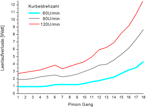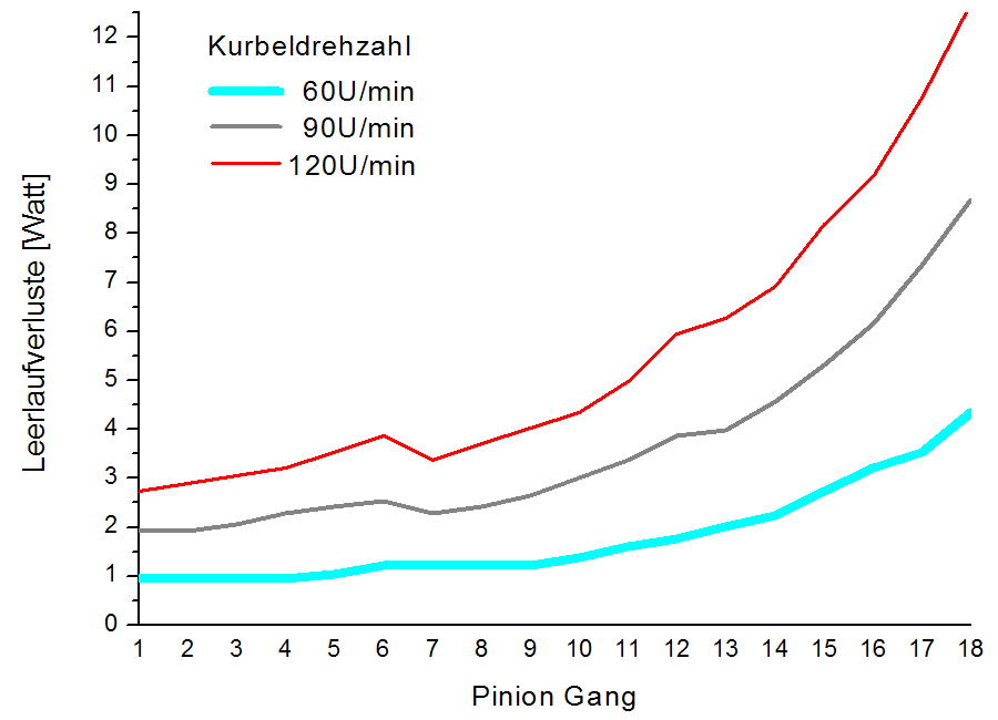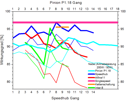 Der Wirkungsgrad der P1.18 liegt hier etwas unterhalb der Rohloff Speedhub – wobei beide Exemplare etliche tausend Kilometer eingefahren wurden. Offiziell wirbt Pinion nicht mit Wirkungsgradangaben – zitiert werden Pinion-Mitarbeiter aber mit »konstant 96 %«. Vermutlich bezieht sich diese Angabe auf hohe Leistungen und ohne die Verluste in Kette und Hinterradnabe. Da die Kette hier 50 % schneller läuft als bei der Speedhub sind dort allein schon etwas höhere, lastunabhängige Verluste versteckt. Zudem hat das Getriebe nicht unerhebliche Leerlaufverluste – insbesondere in den hohen Gängen mit entsprechend schnell drehenden Zahnrädern, was insbesondere bei niedriger Antriebsleistung nachteilig ins Gewicht fällt. Über die Ursache der Leerlaufverluste kann derzeit nur spekuliert werden. Sicher werden die Dichtringe an der Tretlagerwelle dazu beitragen und auch die Planschverluste der vielen Zahnräder im Getriebegehäuse. Bei schnellerer Kurbeldrehzahl steigen die Leerlaufverluste erwartungsgemäß. Allerdings sind sie bei schnellen 120 U/min nicht doppelt so hoch wie bei 60 U/min sondern nur etwa 50–70 % höher. Bei 90 U/min – wie für hohe, aber die Knie schonende Dauerleistungen empfohlen – liegen die Leerlaufverluste 30–40 % über den bei 60 U/min gemessenen.