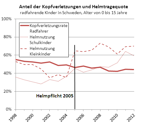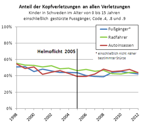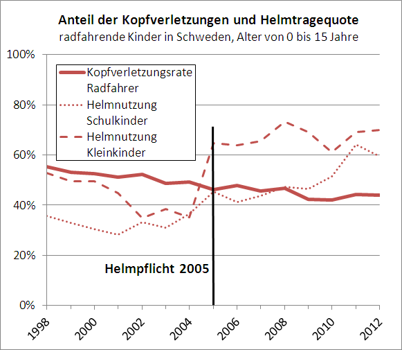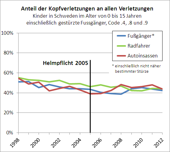 Da sich dieser Rückgang auch auf Fußgänger und Autoinsassen erstreckt, sind es nicht notwendigerweise die Helme, die diesen langsamen Rückgang der Kopfverletzungen bewirkt haben. Dieses Ergebnis wurde in »Reflexen« veröffentlicht, der Fachzeitschrift der Schwedischen Gesellschaft für Verkehrsplaner, und bestätigt damit Ergebnisse aus anderen Ländern in Journalen mit Peer Review.