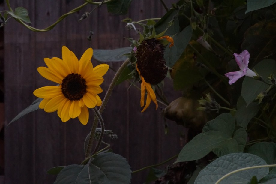 Am letzten Sonntag (lat. »Tag der Sonne«) im September hatte ich Lust, die letzten Sonnenblumen im Garten unseres Wohnprojekts zu fotografieren. Am Abend strahlte dann ein schöner Vollmond vom südöstlichen Himmel herab: