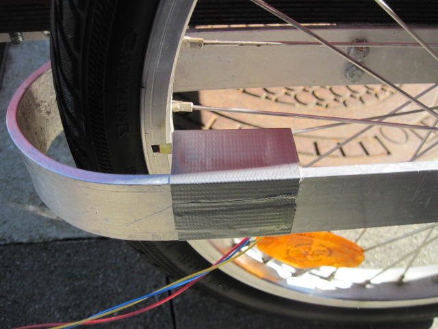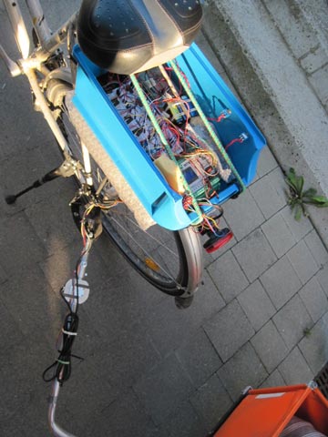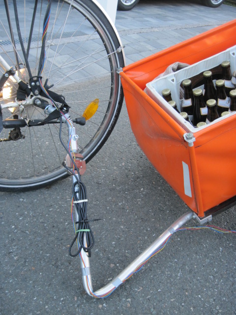 Die komplette Elektronik samt Stromversorgung wurde in einer Stapelbox verpackt, auf dem Gepäckträger des Zugrads montiert und mit den Messleitungen von Hallgeber und Wägezelle verbunden (s. Bild 1 bis 5).