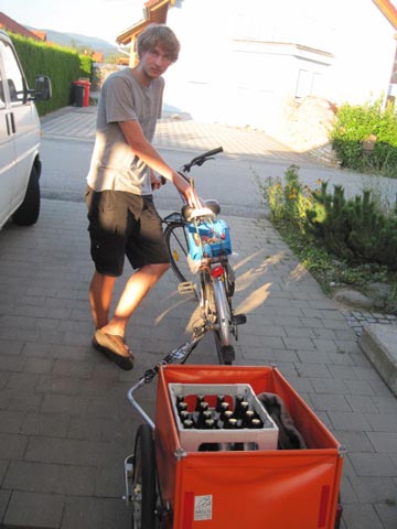 Der Hänger wurde mit einer Kiste Bier und einer PKW-Bremsscheibe aus der Schrottkiste beladen. Damit ergab sich eine Nutzlast von 30,6 kg, was circa 75 % der gewünschten Nenn-Nutzlast von 40 kg ausmacht. Der Hänger mit modifizierter Deichsel wog 13,8 kg, sodass sich ein Gesamtgewicht