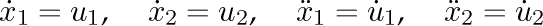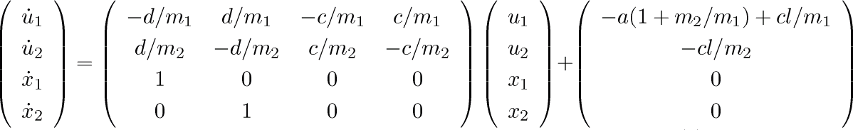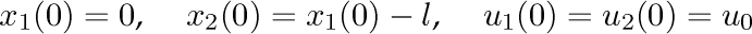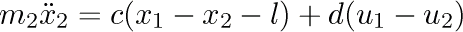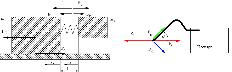 Bild 6 zeigt das Zweikörper-Modell von Rad und Anhänger mit den angreifenden Kräften, wobei Index 1 das Rad und Index 2 den Anhänger bezeichnen, die jeweils die um die Deichsellänge l versetzen Koordinaten x1 und x2 besitzen. Die Massen werden mit m, die Kräfte mit F, die Federkonstante der Kopplung zwischen den Massen mit c, die Dämpfungskonstante mit d und die Geschwindigkeiten mit u bezeichnet. Das gebremste Rad wird als gleitender Körper idealisiert, die am Anhängerrad noch angreifenden Rollreibungskräfte werden als klein gegenüber der Bremskraft angesehen und deshalb vernachlässigt.