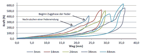 In einer von K. Huber 2013 an der TU Graz durchführten Bachelor-Arbeit [Huber 2013] werden für eine baugleiche Radanhängerdeichsel, die im eingangs genannten Sozialprojekt verwendet wurde (Beschäftigungsprojekt für arbeitslose Roma unter Trägerschaft der Vinzenzgemeinschaft Graz), Versuche zur Ermittlung der Deichselsteifigkeit beschrieben. Aus Druckversuchen wird darin ein Wert von cD = 53000 N/m für die Deichselsteifigkeit ermittelt und für die Kupplungsfeder (s. Bild 7) abhängig von der wirksamen Federlänge ein Diagramm angegeben, das eine progressive Federwirkung ab etwa 100 N Zugkraft zeigt (s. Bild 8). Die Feder wirkt dabei wegen der 45 Grad-Anlenkung vor allem als Biegefeder. Bis 100 N ergeben sich aus dem Diagramm z.B. bei 24 mm freier Federlänge, wie sie in den hier beschriebenen Tests vorlag, etwa 5.000 N/m, darüber im Bereich bis zu etwa 300 N Zugkraft steigt der Wert bis auf etwa 20.000 N/m.