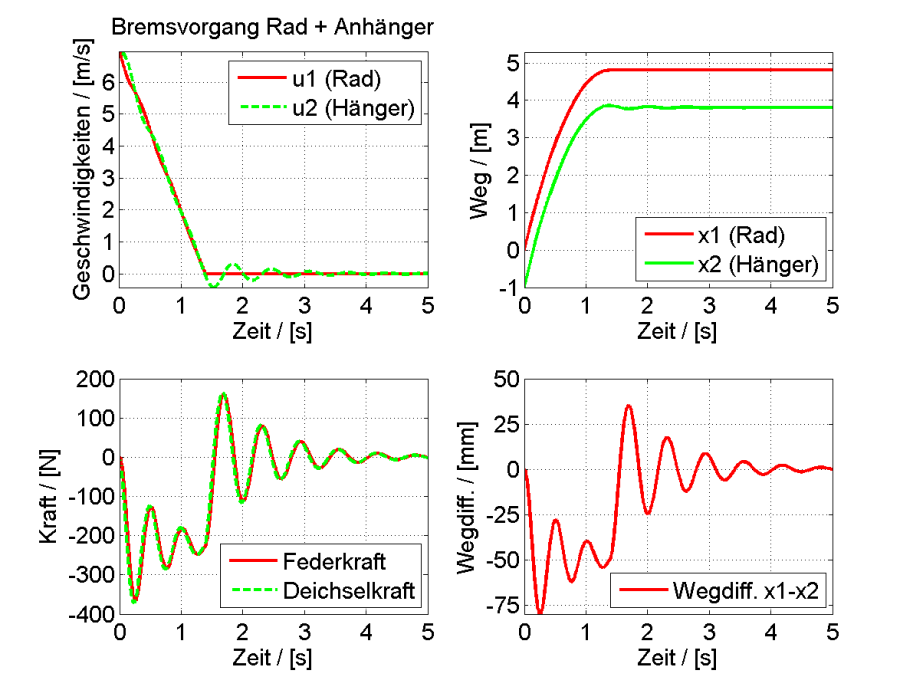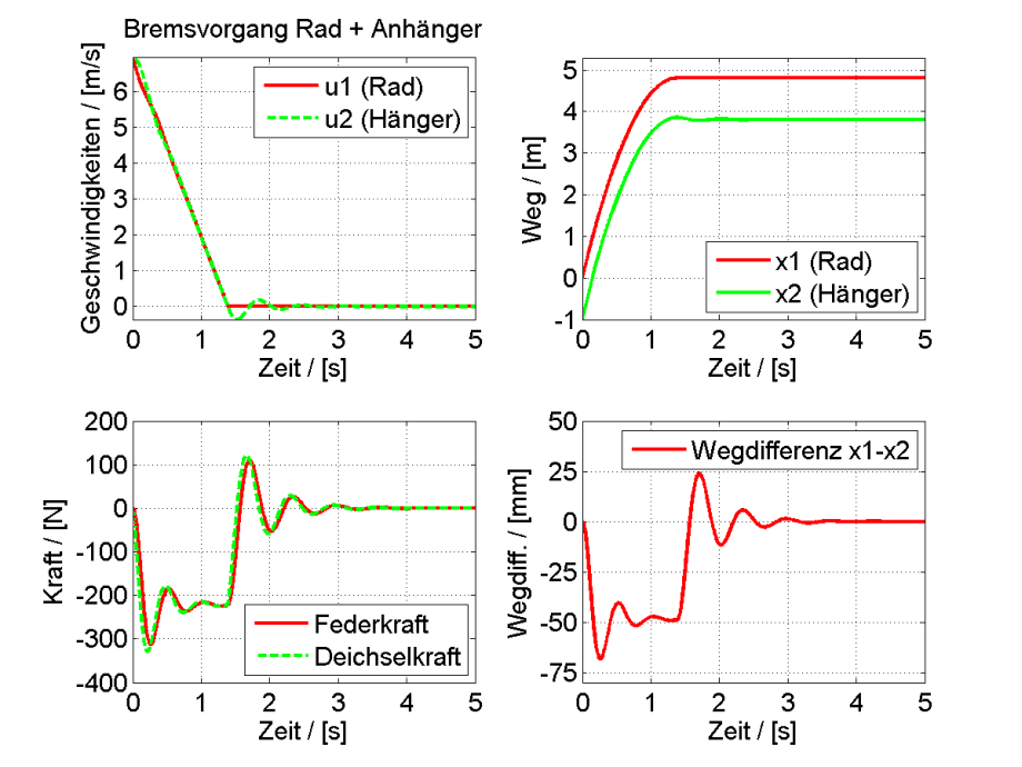 Die Verläufe von Weg und Geschwindigkeiten in Bild 9 und 10 sind insgesamt plausibel. Die Abbremsung dauert etwa 1,5 s. Der Bremsweg beträgt etwa 4 m. Man erkennt in den Kraftschwingungen sowie in den Teilbildern der Relativbewegung (Bilder rechts unten in Bild 9 und 10) auch deutlich ein Nachschwingen des Hängers, nachdem das Rad bereits zum Stillstand gekommen ist. Das konnte bei den Testfahrten ebenfalls beobachtet werden.