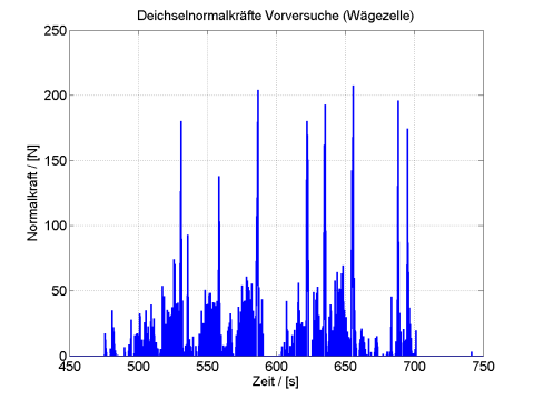 Zunächst wurde eine Reihe von acht aufeinander folgenden Testfahrten gemacht, die in einem gemeinsamen Datensatz abgespeichert wurden. Diese Vortests dienten der Prüfung der prinzipiellen Funktion des Messaufbaus und insbesondere der Klärung der Frage, in welcher Größenordnung die Bremskräfte in der Deichsel liegen. Daher wurde nur das Kraftsignal ausgewertet, das in Bild 11 gezeigt ist. Der dargestellte Messzeitraum umfasst 300 s, worin acht Vollbremsungen an den Kraft-Peaks zu erkennen sind. Die Peaks umfassen jeweils etwa zwei Sekunden Bremszeit, die mit zahlreichen Messpunkten aufgelöst wurden, was hier im Gesamtbild wegen des großen Gesamt-Zeitintervalls jedoch nicht zu erkennen ist.