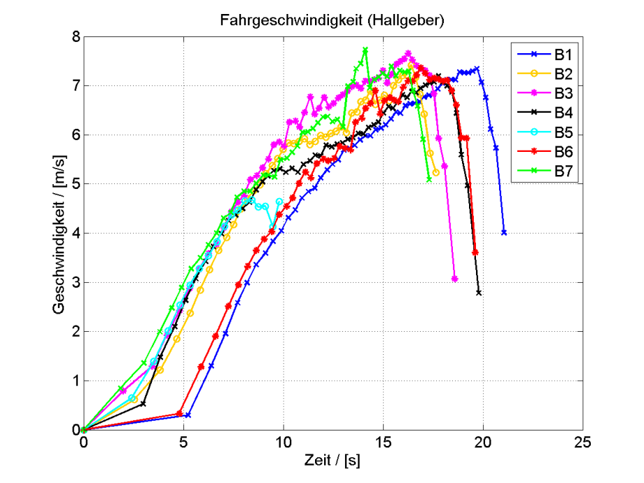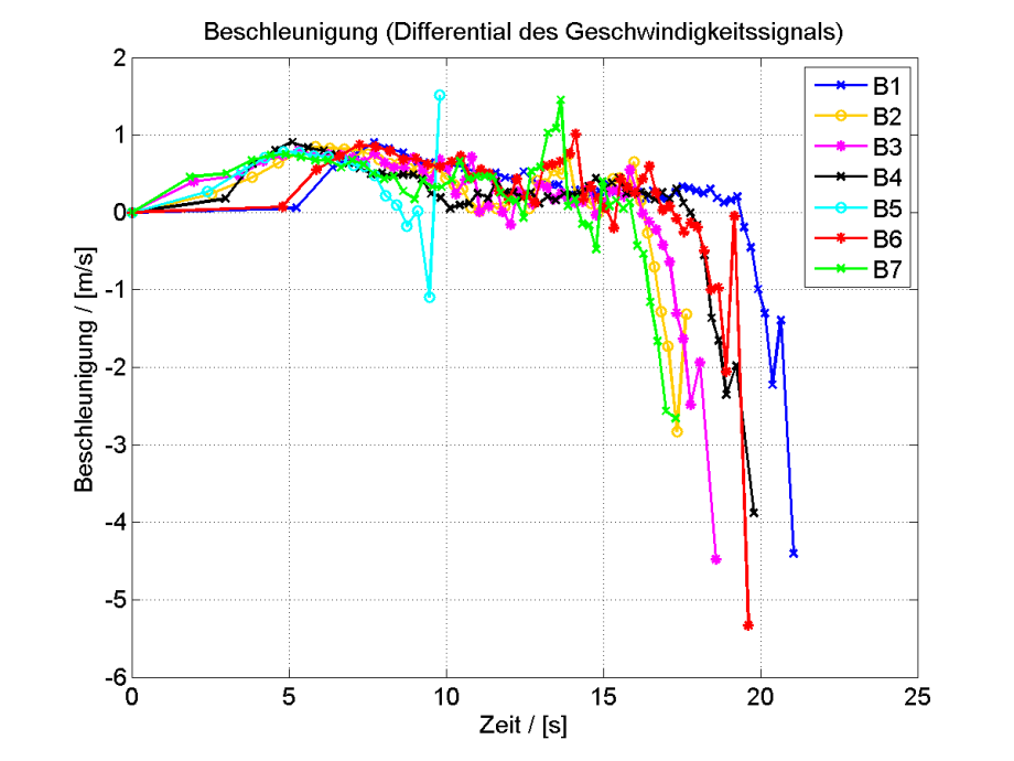Bild 12 zeigt die Geschwindigkeitsverläufe für die zweite Versuchsreihe. Man erkennt, dass jeweils etwa 7…7,5 m/s entsprechend 25…27 km/h als Höchstgeschwindigkeit erreicht werden, bevor dann die Bremsung einsetzt. Die Geschwindigkeitswerte fallen danach stark ab, gehen jedoch nicht ganz auf Null zurück, was von der doch recht groben Diskretisierungs-Schrittweite des Hallgebers herrührt.