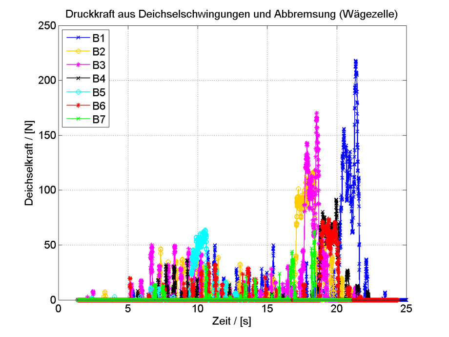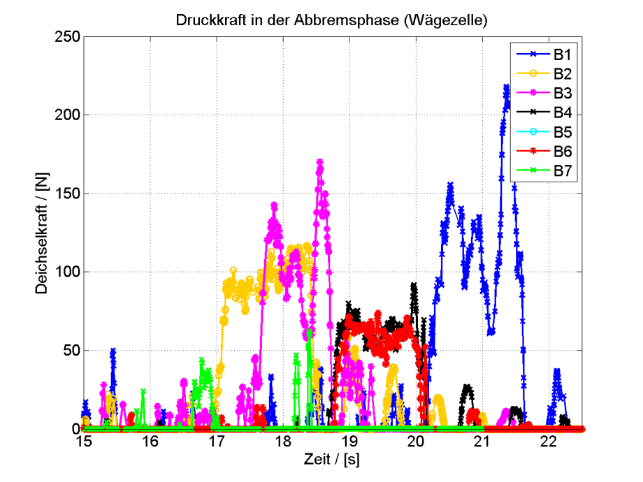 Die Hauptaussage dieser Abbildung ist, dass in der Deichsel in den Vortests maximale Normalkräfte bis zu einer Höhe von etwa 210 N auftreten. Da die Bremskraft in Fahrtrichtung wirkt, die Deichsel jedoch unter 45 Grad angelenkt ist, kann man die Bremskraft in eine Normal-Komponente in Deichselrohrrichtung (Wägezelle) und in eine Querkraft zerlegen, die ein Biegemoment für die Deichsel bewirkt. Daraus ergibt sich eine maximale Gesamt-Bremskraft von etwa 300 N, was im Bereich der oben dargestellten Rechenergebnisse für die Fälle mit stärkerer Dämpfung liegt.