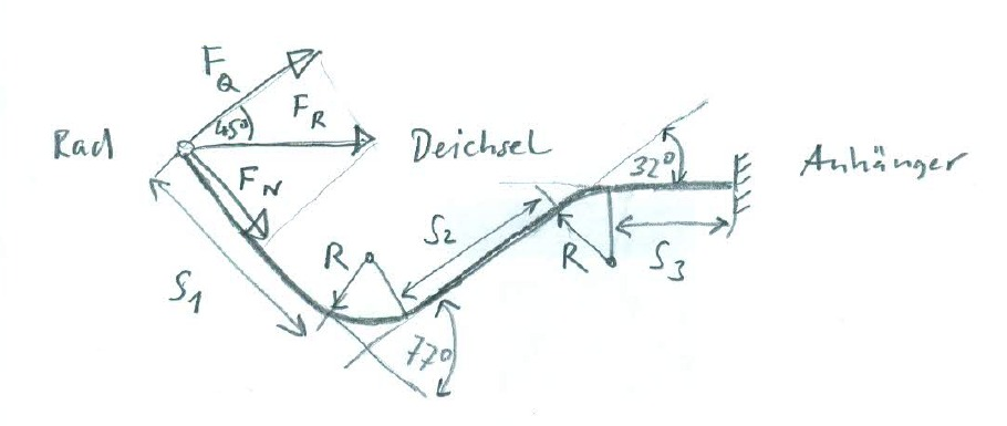Im nächsten Schritt wird die Deichselkrümmung berücksichtigt. Dabei wird näherungsweise die Verteilung von Querkraft FQ, Normalkraft FN und Biegemoment MB entlang der Deichsel unter Verwendung der aus den Versuchsergebnissen erhaltenen Belastungsdaten bestimmt. Dazu werden die Differentialgleichungen für FQ, FN und MB entlang der gekrümmten Deichsel integriert (siehe [Dankert et al. 2006a] ).