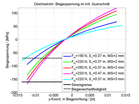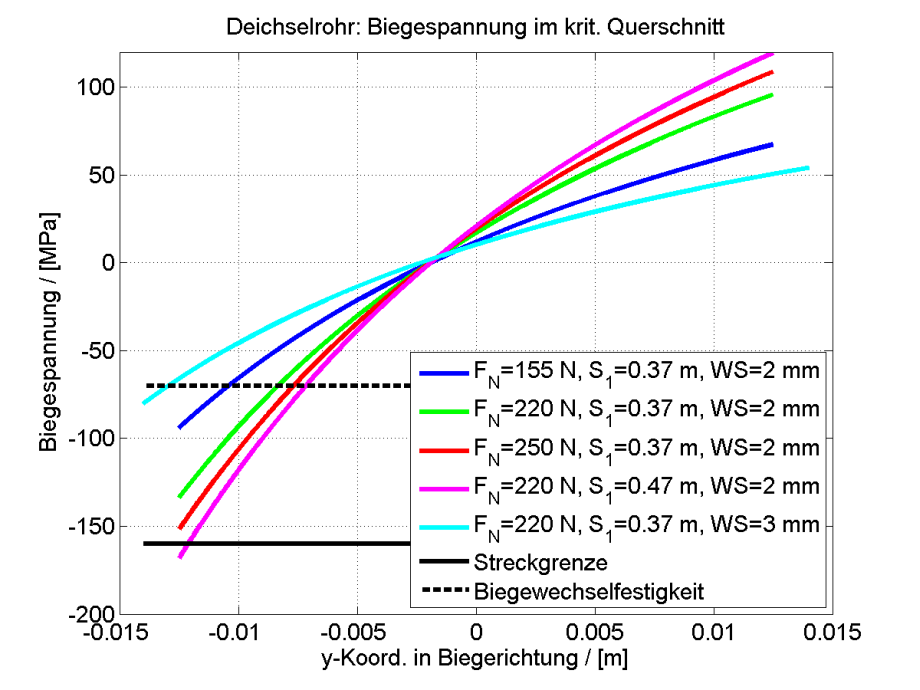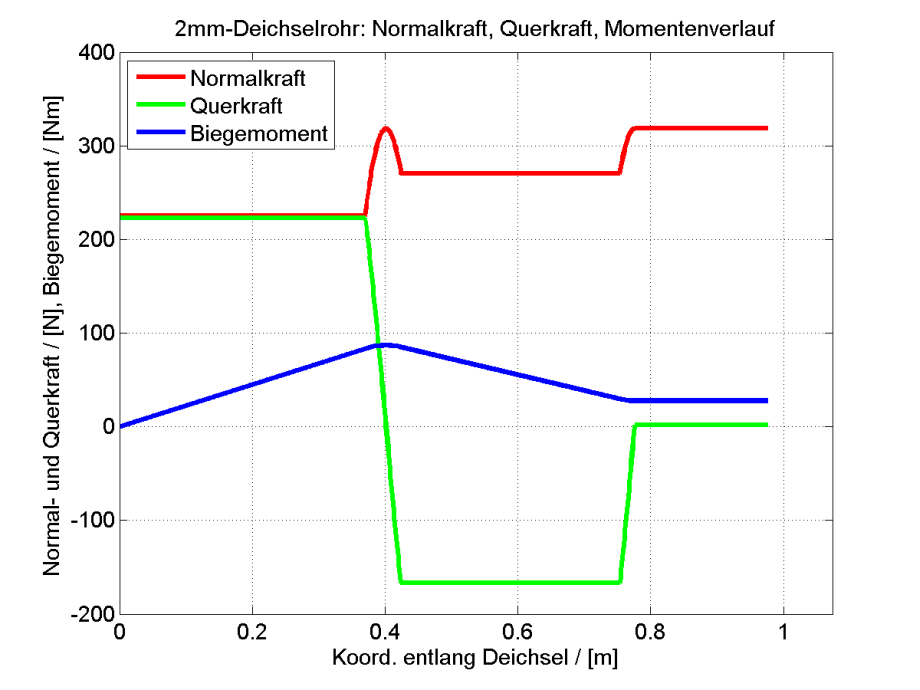 In den Berechnungen wurde die veränderte Deichselgeometrie (Verlängerung um die Länge der Wägezelle plus Aufnehmer) sowie die maximal in den Versuchen aufgetretene FN = 220 N verwendet. Weiter wurde von einem idealen kreisringförmigen Querschnitt ausgegangen.
