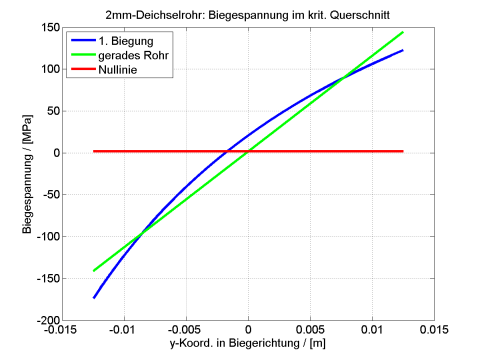 Weiter ist in Bild 20 der Spannungsverlauf im kritischen Querschnitt in der Knickebene gezeigt. Man erkennt deutlich die Spannungsüberhöhung auf der Druckseite bei Berücksichtigung der Krümmung (blaue Kurve) gegenüber der linearen Standardspannungsverteilung (grüne Kurve) beim glatten Rohr. Der Normalspannungsanteil ist mit etwa 2 MPa sehr gering, weshalb vor allem die Biegebelastung kritisch ist. Als maximale Biegespannung in der Druckzone wird ein Wert von etwa 175 MPa erreicht, der bereits über der Streckgrenze für AlMGSi05 von 150…160 MPa liegt [Hoepke 2002] und auf eine mögliche Plastifizierung am Rohrrand hinweist.