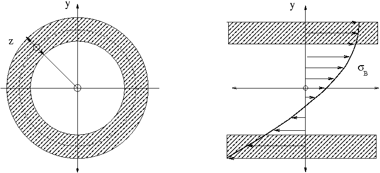 Zur besseren Orientierung über die Lage der Spannungsverteilung und die verwendeten Hilfskoordinaten sind in Bild 21 noch zwei Skizzen angegeben. Links ist die Querschnittskoordinate y gezeigt sowie die Wanddickenkoordinate z, die von der Rohrwandmitte aus gezählt wird und in der im folgenden behandelten zweiachsigen Spannungsbetrachtung auftritt. Weiter ist rechts noch die prinzipielle Lage der Spannungsverteilung nach Gleichung 15 angegeben.