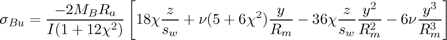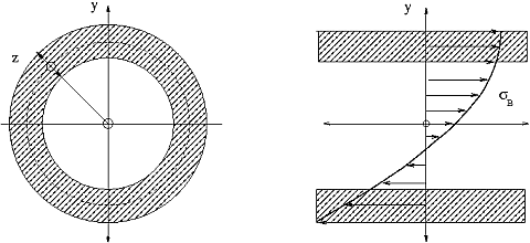 an. Darin bezeichnet I das Flächenträgheitsmoment des Rohrquerschnitts, Rm den mittleren Rohrradius, RB den Biegeradius und sw die Rohrwandstärke. Schwaigerer [Schwaigerer et al. 1997] gibt ebenfalls Formeln für die Längsbiegespannung im gekrümmten Rohr an, die mit der Koordinate z noch zusätzlich den Spannungsverlauf über die Wandstärke erfasst (gemessen vom mittleren Rohrradius, sodass z = +sw ÷ 2 die Rohraußenseite und z = -sw ÷ 2 die Rohrinnenseite bedeutet, während die Koordinate y den Abstand von der neutralen Faser der Biegung misst. Die Beziehungen von Schwaigerer für Längs- und Umfangsbiegespannung lauten