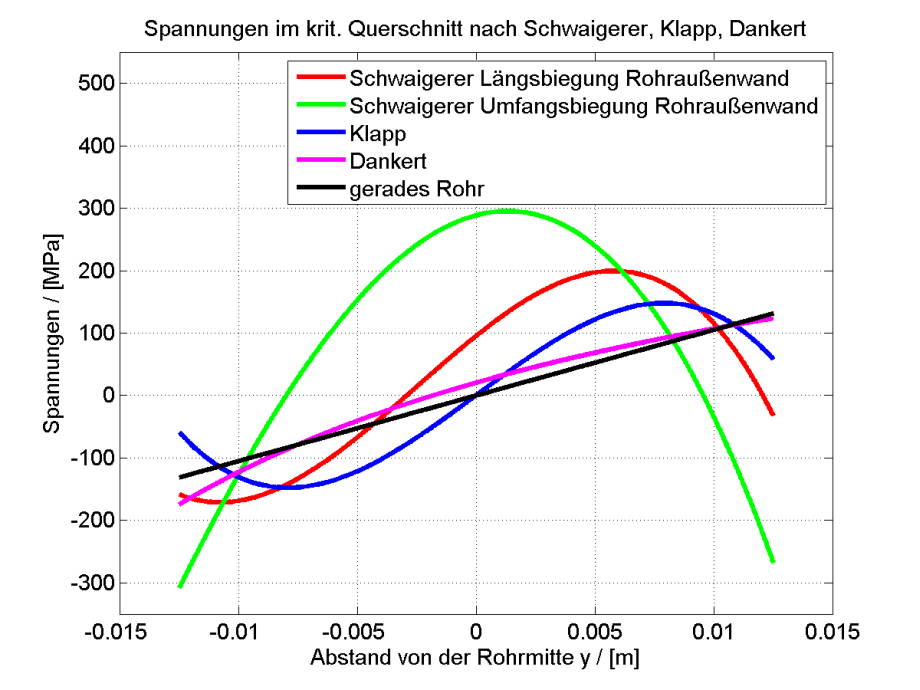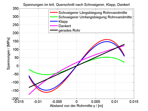 Man erkennt, dass die Beziehungen von Schwaigerer und Klapp für die Längsbiegung recht ähnlich sind. Sie zeigen sowohl auf der Innen- als auch auf der Außenseite des Rohres ebenfalls eine Spannungsüberhöhung gegenüber dem geraden Rohr, allerdings keine so starke betragsmäßige Erhöhung auf der Druckseite, wie es bei Dankert der Fall ist. Auch hier wird die Streckgrenze erreicht. Die zusätzlich berücksichtigte Umfangsbiegespannung ist in der Rohrwandmitte deutlich kleiner als die Längsbiegespannung. Weiter sind die Spannungsmaxima etwas zur neutralen Faser hin nach »innen« verschoben, was nach Klapp [Klapp 1970] eine Folge der zusätzlichen elliptischen Deformation ist.
