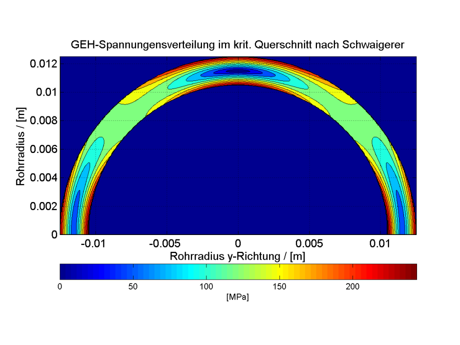 Da die Formeln von Schwaigerer einen zweiachsigen Spannungszustand beschreiben, sind hierfür zum Vergleich mit den unten dargestellten FEM-Rechenergebnissen in Bild 24 noch die Vergleichsspannungen nach Gestaltänderungshypothese (GEH) [Winkler et al. 1985b] als Konturplot im kritischen Rohrquerschnitt dargestellt, wobei etwaige Schubspannungen als klein gegenüber den Biegespannungen angesehen und vernachlässigt werden. Man erkennt in Bild 24 deutlich die Spannungsmaxima an der Innen- und Außenbiegung links und rechts im Bild sowie in der neutralen Faser der Deichselkrümmung (Bildmitte), die unmittelbar an der Rohrwand auftreten. In der Mitte der Rohrwand sind diese Maxima dagegen nicht mehr zu sehen, d.h. die sehr hohen Randspannungen klingen zur Wandmitte hin wieder ab, so dass vor allem am Rand plastisches Verhalten auftreten dürfte.