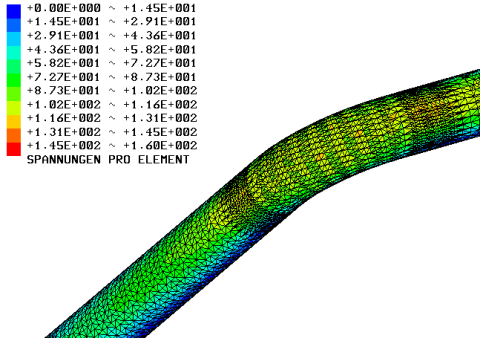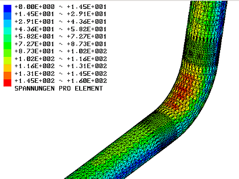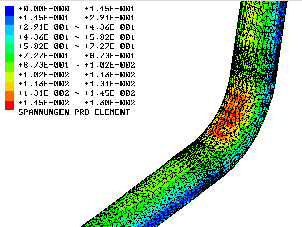 Die Ergebnisse der FEM-Rechnungen mit Z88 Aurora sind in Bild 25 und 26 für den Fall einer Normalkraft von 250 N gezeigt. Die dargestellten Elementspannungen werden in Z88 Aurora mittels der GEH aus den benachbarten Knotenspannungen ermittelt. Man sieht aus den Bild 25 und 26, dass die maximalen Spannungen in Übereinstimmung mit der Theorie des gekrümmten Trägers nach Dankert auf der Druckseite entstehen und im dargestellten Fall von FN = 250 N die Streckgrenze von etwa 160 MPa erreicht wird. Die zusätzlichen Spannungen aus der elliptischen Deformation werden in dieser einfachen FEM-Rechnung nicht dargestellt, was an der ungenügenden Auflösung der Rohrwand durch nur eine Schicht von Tetraeder-Elementen liegt.