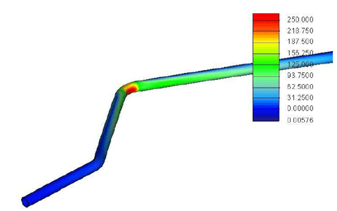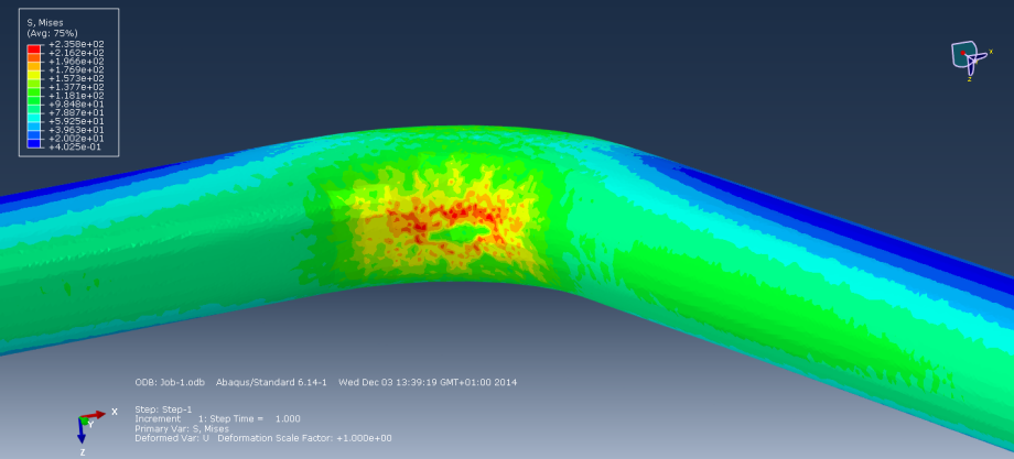 Eine Vergleichsrechnung, die mit einem feineren Netz (ca. 3 Millionen Elemente) und dem FEM-Programm Abaqus an der Universität Bayreuth durchgeführt wurde, bestätigt diesen Befund [Frisch] . Hier treten ebenfalls deutlich über der Streckgrenze liegende Spannungen an der Innenbiegung auf, (s. Bild 28), die maximal 235 MPa erreichen. Die im Vergleich zu Z88 höheren Werte können damit erklärt werden, dass hier die Rohrwand radial mit mehreren Schichten aufgelöst wird, während in Z88 nur eine Schicht von Tetraeder-Elementen verwendet wurde, was eher zu den in Bild 22 dargestellten mittleren Werten passt. Allerdings werden in der Abaqus-Rechnung wie auch in der Z88-Rechnung die recht hohen Spannungen in der Ebene der neutralen Faser der Biegung, die nach den genaueren analytischen Formeln von Schwaigerer auftreten sollten, nicht wiedergegeben. Eine Erhöhung auf 120 MPa sieht man aber dennoch. Wie oben schon erwähnt, klingen die Randspannungen nach Schwaigerer zur Rohrwandmitte hin rasch ab, was auch auf dem feinen Netz bei zu geringer radialer Auflösung zu niedrigeren gemittelten Spannungen führen dürfte, als der exakte Randwert in der analytischen Lösung angibt.