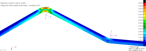 Auch diese Rechnungen zeigen deutlich die Spannungsüberhöhung an der Innenseite der Deichselbiegung. Weiter kann man hier nun auch die zusätzliche Spannungserhöhung aus der elastischen elliptischen Verformung erkennen, die in der Ebene der neutralen Faser der Biegung auftritt (s. Bild 29 und 30). Für einen direkten Vergleich sind die Spannungen in Bild 30 mit einem Faktor 3 zu multiplizieren, da hier mit einer Bremskraft von 100 N gerechnet wurde.