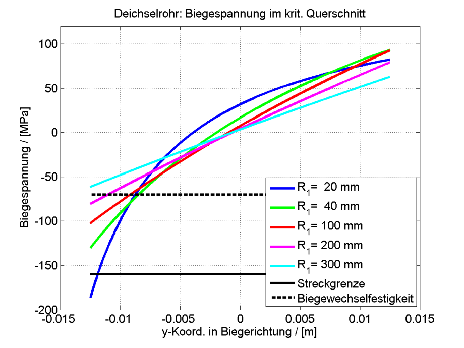 Da eine wichtige Ursache für das Überschreiten der Streckgrenze die Spannungsüberhöhung durch die bauartbedingte Krümmung der Deichsel sein dürfte, wurde noch der Effekt des Krümmungsradius auf die Spannungsverteilung im kritischen Querschnitt untersucht. Dazu wurden Rechnungen bei fixem Winkel von 77 Grad in der ersten Biegung, aber mit variiertem Krümmungsradius mit der 1D-Theorie des gekrümmten Trägers nach Dankert durchgeführt. Dabei zeigte sich, dass eine Erhöhung des Krümmungsradius in zweierlei Weise günstig ist: Zum einen wird die Spannungsüberhöhung auf der Druckseite reduziert, zum andern wird auch noch der maximale Hebelarm der Bremskraft reduziert, da der Krümmungsscheitel nach innen hin zur Fahrzeuglängsachse rückt.