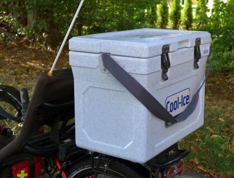 Der regelmäßige Einkauf von Eis im einige Kilometer entfernten Bauernladen war mit einer billigen Kühlbox aus dem Tankstellenshop auf dem Anhänger immer eine Wettfahrt gegen das Auftauen der kalten Leckerei. Die Suche im Internet nach einer kompakten, hochwertigen Kühlbox führte im Anglerbedarf zum Erfolg. Es war vorab nicht zu 100 % zu klären, ob die kleine Kühlbox mit 13 Liter Inhalt wirklich passt. Zum Glück passte sie Zentimeter genau auf die Grundplatte für den Ortlieb-Gepäckträgeradapter und ebenso knapp auf dem Gepäckträger hinter die Kopfstütze des Liegetrikes.