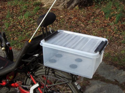Weil das Basteln mit Ortlieb-Gepäckträgeradapter so erfolgreich war, folgte noch eine durchsichtige Kunststoffbox, für nässe- und staubefindliche Einkäufe oder Schüttgut, wie z.B. Blumenerde.