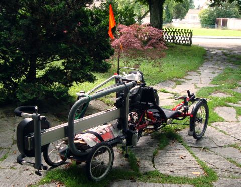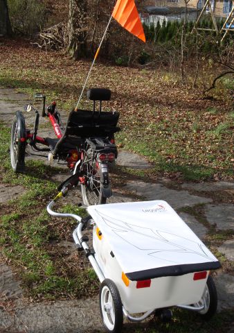 Der Autor kaufte 2011 zusammen mit dem Liegetrike einen hochwertigen Carryfreedom Y-Frame Small Transportanhänger. Auch mit diesem Anhänger sind die gemachten Erfahrungen sehr gut. Es lassen sich damit erstaunlich sperrige Dinge transportieren. Aber dank der Körbe, der Kühlbox usw. und dem Leggero Max kommt dieser Anhänger nur noch so selten zum Einsatz, sodass die Reifen vor jedem Einsatz aufgepumpt werden müssen. Würde er wieder mehr eingesetzt, würde der unpraktische Sandpapierbelag der Sperrholz-Ladefläche durch einen Gummibelag ersetzt und der Anhänger mit Zurrösen und Gurten aus dem Angebot von hinterher.com aufgewertet.