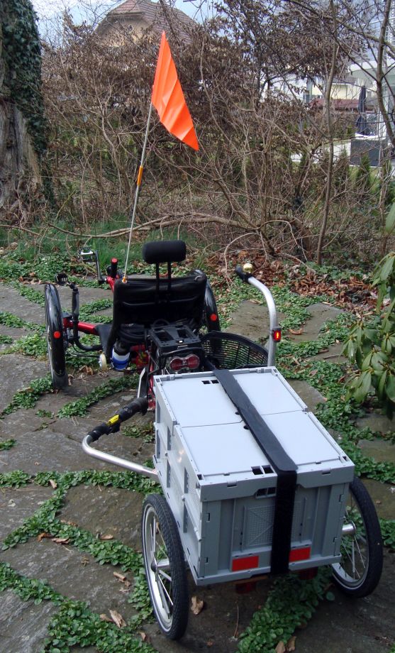 Damit der Anhänger auch vollbeladen gut zu sehen, ist wurde die dazu beschaffte, große, faltbare Kunststoffbox mit Reflektoren versehen und ein LED-Akku-Rücklicht zum Befestigen an der Handdeichsel gekauft. »Wird das Rücklicht des Fahrrads durch den Anhänger und seine Ladung verdeckt, muss der Anhänger zu den vorgeschriebenen weißen Rückstrahlern vorne und den roten Rückstrahlern hinten zusätzlich mit einem roten oder orangenem Rücklicht ausgerüstet sein«, schreibt der Gesetzgeber dazu.
