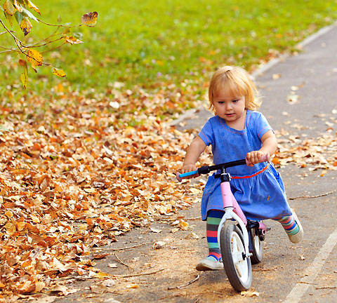 Methode Laufrad: Auf einem Laufrad können sich schon sehr kleine Kinder bewegen. Mit zunehmender Größe und Geschick werden sie schneller, rollen und heben dabei auch die Beine an. Dabei entwickeln sie intuitiv das richtige Lenkverhalten, um das Gleichgewicht zu erhalten – also ähnlich dem Roller. Das Laufrad ist aber einfacher handzuhaben, weil über den Sattel eine weitere Kopplung zum Körper besteht.