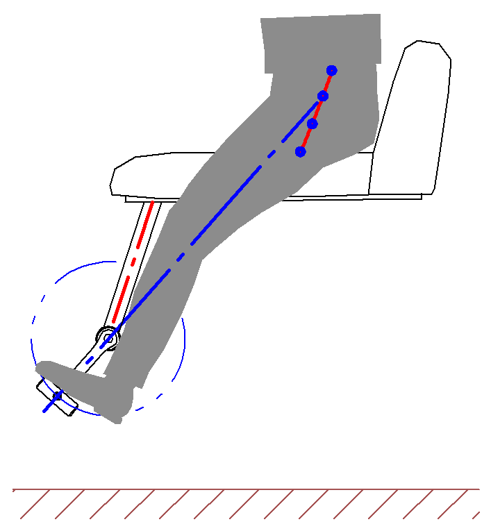 Bild 4: In unterster Sitzposition (orange) müssen die Oberschenkel akrobatisch angewinkelt werden. Der enge Raum (gelb) ergibt sich aus der praktizierten Fuß-Boden-Regel plus einem zu großen Kurbelkreis (orange) dank langen Kurbeln, angepasst an der Größe des Fahrrads.