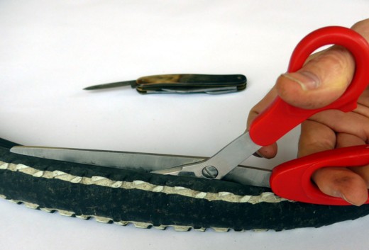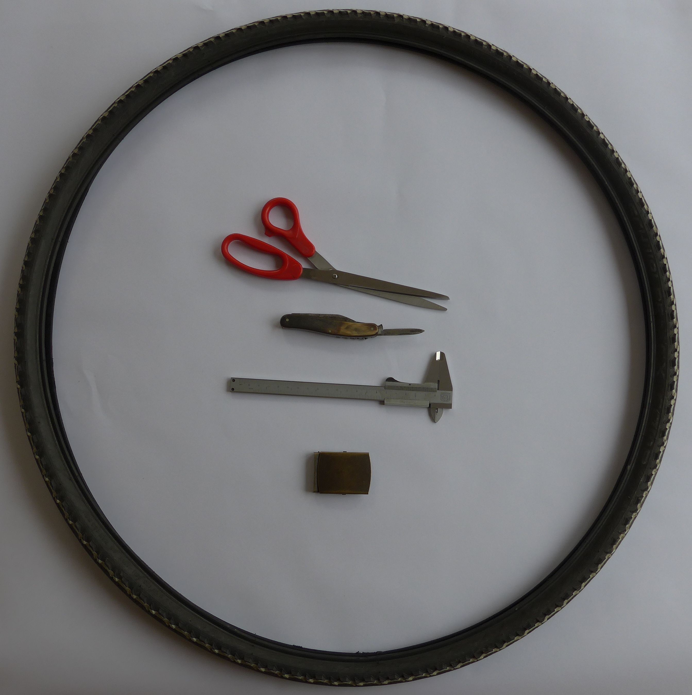Die Beschaffung alter Fahrradmäntel ist das geringste Problem. Für eine übliche Jeans bietet sich eine Gürtelbreite von 35–40 mm an. Sinnvoll ist es somit, einen Alt-Reifen mit nominell 28–37 mm Breitenangabe zu besorgen. Wenn man die Seitenwand mit einem Messer durchsticht, lässt sich der Profilstreifen problemlos mit einer etwas stabileren Büro- oder Textilschere ausschneiden. Die Reifendrähte muss man nicht durchtrennen. Nachdem das Profilband ausgeschnitten ist, empfiehlt sich eine gründliche Reinigung im Waschbecken mit Seife und (Nagel-)Bürste.