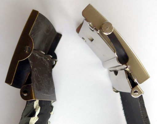 Zuvor sollte man sich aber auf die Suche nach einer geeigneten Gürtelschnalle machen. Möglicherweise finde sich ein abgelegter, unschön gewordener Gürtel im Schrank, den man seiner Schnalle berauben kann. Gut sortierte Schuster haben auch eine Auswahl an Schnallen vorrätig. Persönlich finde ich für den Reifengürtel eine Klemmschnalle passend. Diese erlauben, die Schnalle werkzeuglos und ohne Umschlagen an das eine Gürtelende zu klemmen. Das Schließen und Einstellen der Länge des Gürtel erfolgt durch Klemmen mittels einer Klappe mit Zähnen oder einem in einer Keilnut geführten Bolzen. Solche Klemmschnallen werden oft an Textilgürteln verwendet. Damit sind sie allerdings nur für Reifen mit dünnem bzw. abgefahrenem Profil geeignet. Gegebenenfalls lassen sich aber die Klemmzähne kürzer feilen. Grobes MTB-Profil ist damit aber in keinem Fall kompatibel.