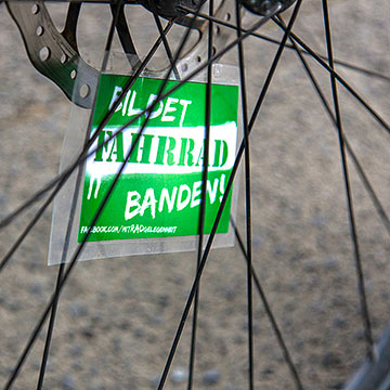 Wild und romantisch passt gut zu uns. Als wir vor drei Jahren anfingen, war unsere erste Aktion die »mitRADgelegenheit«. Ziel war es, den Spirit der Critical Mass in den Alltag zu holen. Wir boten gemeinsame Fahrten, mitRADgelegenheiten, zu Unis, Konzerten und anderen Veranstaltungen an. Um diese mitRADgelegenheiten zu bewerben benutzten wir den Slogan »Bildet Fahrrad Banden«. Daraus ist dann von ganz alleine »FahrradBande« als Name unsere Gruppe entstanden. Um zum zweiten Teil deiner Frage zu kommen. Wir sehen uns eher als Kollektiv und haben daher keinen Anführer, auch wenn das etwas untypisch für eine Bande ist. Klar kannst du bei uns mitspielen! Auf fahrrad-bande.org findest du unsere interaktive Karte. Dort kannst du deine eigene mitRADgelegenheit anlegen und Leute suchen, die mit dir zusammen fahren. Wenn du aus Berlin bist kannst du zu unseren Treffen kommen und mit uns Aktionen planen. Um bei uns mitzumachen musst du auch keine Mutprobe bestehen. Auch wieder untypisch für eine Bande.