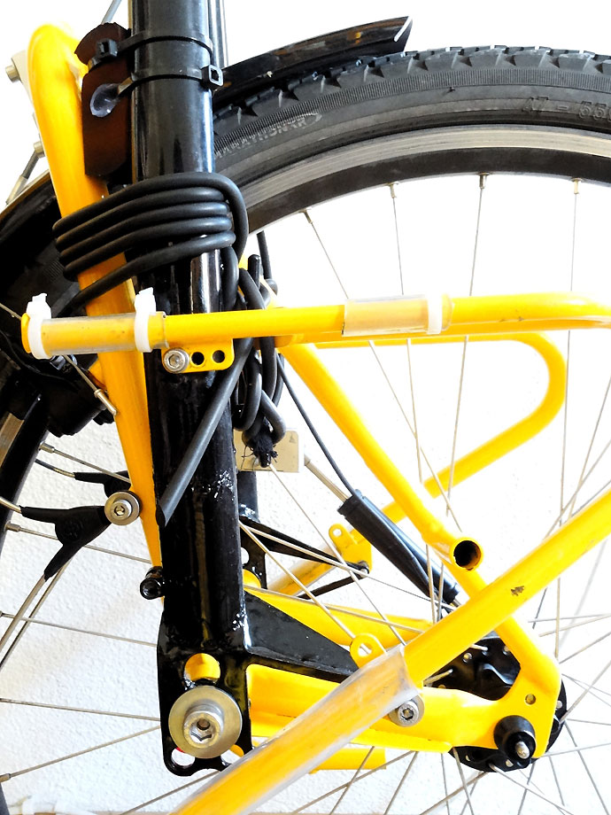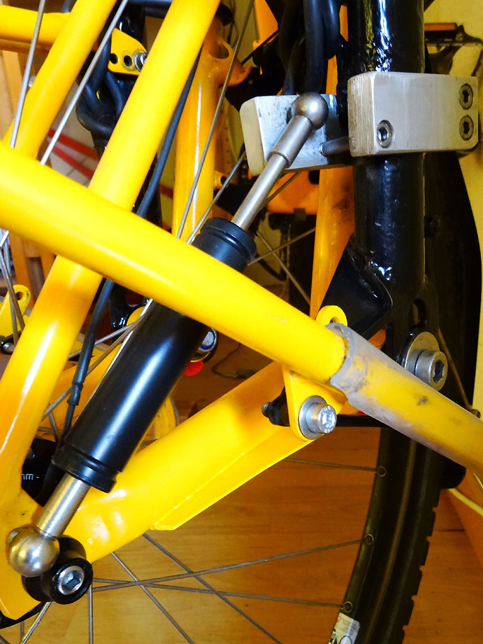 Am Rahmen habe ich vor allem am Gepäckträger Versteifungen eingefügt und schießlich auch noch einen kleinen Öldämpfer eingebaut [Bild 2]. Und siehe da, jetzt ließ sich das Rad auch bei Beladung mit vier Taschen (vorne und hinten) fahren – das Flattern war soweit minimiert, dass man es gut kontrollieren konnte und es nur selten auftrat.