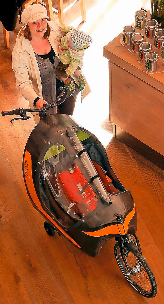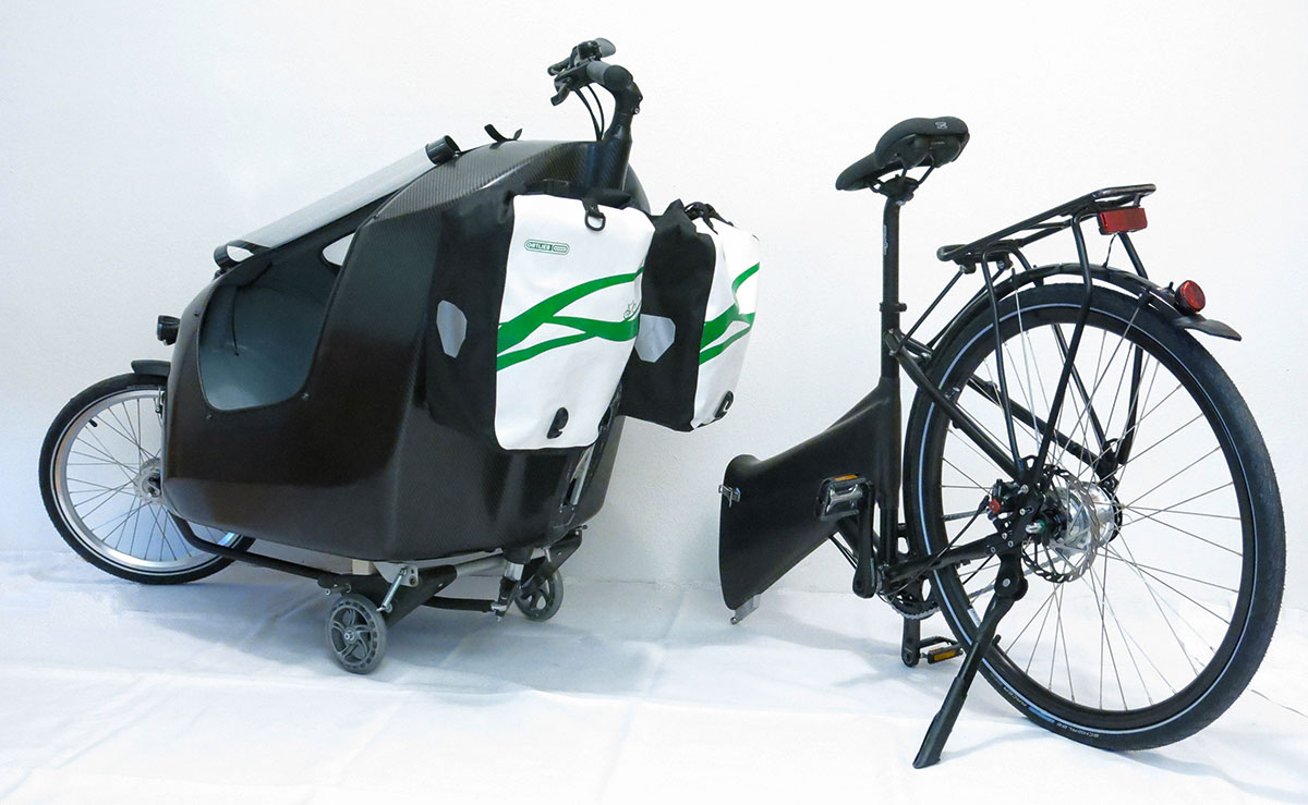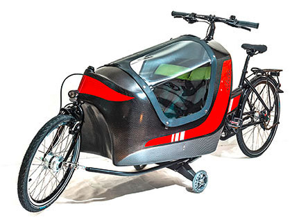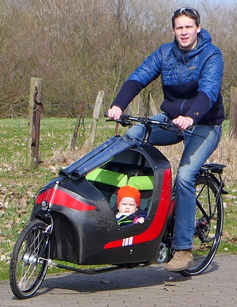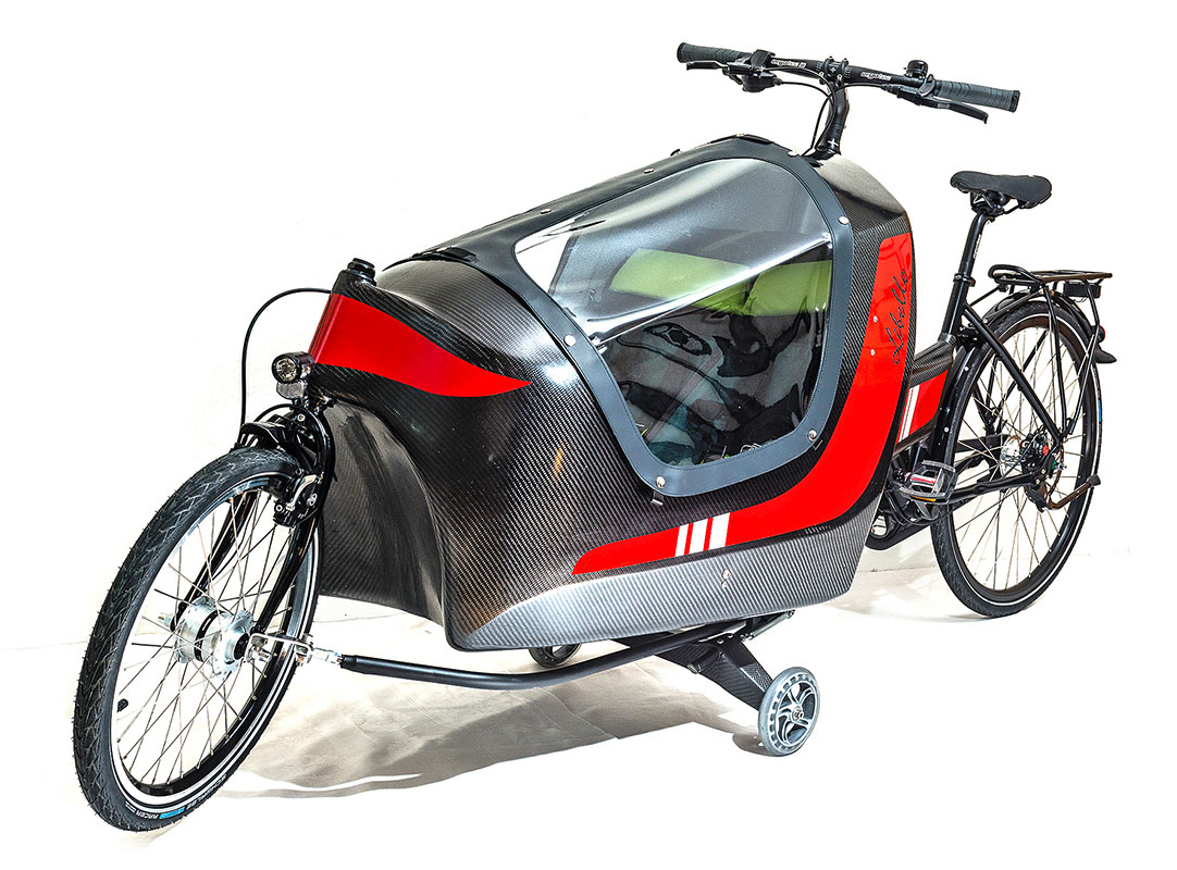 Nach einigen Designstudien auf Papier und später im Maßstab 1:10 aus Formbauschau wurde ein erster Prototyp erstellt. Ein Formpositiv aus einem leicht zu bearbeitenden PU-Schaum wurde hergestellt und mit einer akzeptablen Oberfläche versehen. Die angefertigte Negativform aus Polyester bildete die Grundlage für die erste selbsttragende Lastenradkabine. Der erste Prototyp war noch etwas »weich«, ließ sich aber ohne Last bereits angenehm fahren. Durch die Elastizität des Carbon-Materials konnte man zudem die Bereiche der stärksten elastischen Verformungen leicht erkennen und entsprechende Verstärkungen vorsehen. Als Kindersitz wurde ein handelsüblicher Sitz mit 5-Punkt Gurten aus einem Anhänger eingebaut.