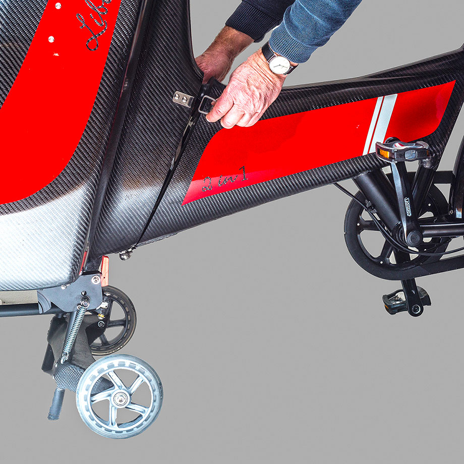 Nach einem Jahr Entwicklungsarbeit war die »Libelle 2in1« fertig. Der hintere Teil der Libelle kann nun innerhalb von Sekunden mit wenigen Handgriffen abgetrennt werden, sodass die Kabine zum Kinderwagen wird. Dabei werden die Züge für Schaltung und Bremse über Wipp-Mechanismen automatisch getrennt und verbunden. Der Ständer kann so umgeklappt werden dass der vordere Teil auf drei Rädern steht. Das 20-Zoll-Vorderrad und die Lenkung samt Bremse können so am Kinderwagen weiter genutzt werden.