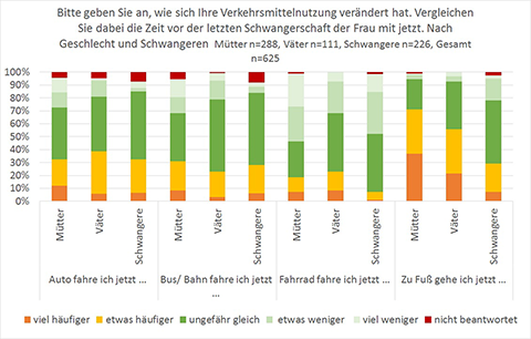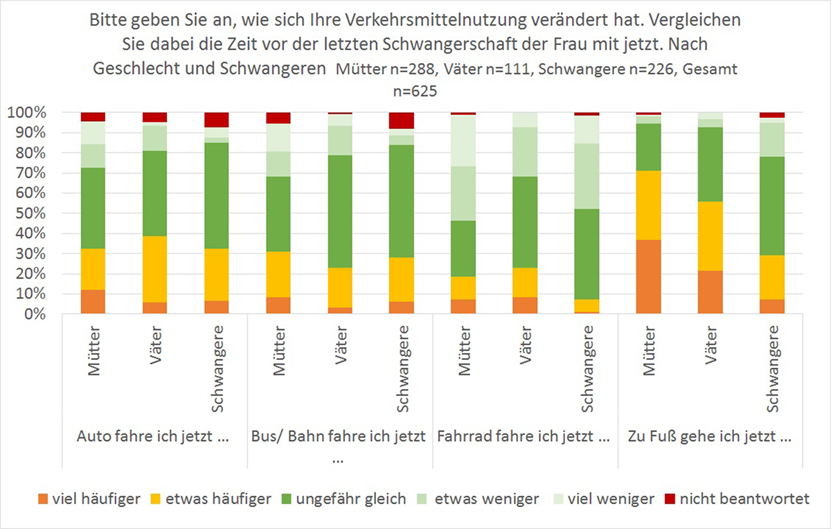 Zum Radfahren mit Baby geben die befragten Eltern an, dass es schön ist wieder mobil sein zu können, aber die oft mangelhafte Radinfrastruktur für Fahrradanhänger und Lastenräder sowie das Verhalten anderer Verkehrsteilnehmenden den Spaß eindämmen. Mit diesen Problemen geht eine Änderung der Verkehrsmittelwahl einher, obwohl die Teilnehmenden der Umfrage wie berichtet sehr radaffin sind. Während der Schwangerschaft fahren etwa die Hälfte der Frauen weniger Rad: 32 % etwas weniger und 14 % viel weniger. Mütter fahren noch weniger Fahrrad: 25 % fahren etwas weniger und 27 % viel weniger (siehe Bild 1). Bei Vätern ist die Veränderung bei allen Verkehrsmitteln deutlich geringer, daher werden sie hier nur am Rande betrachtet.