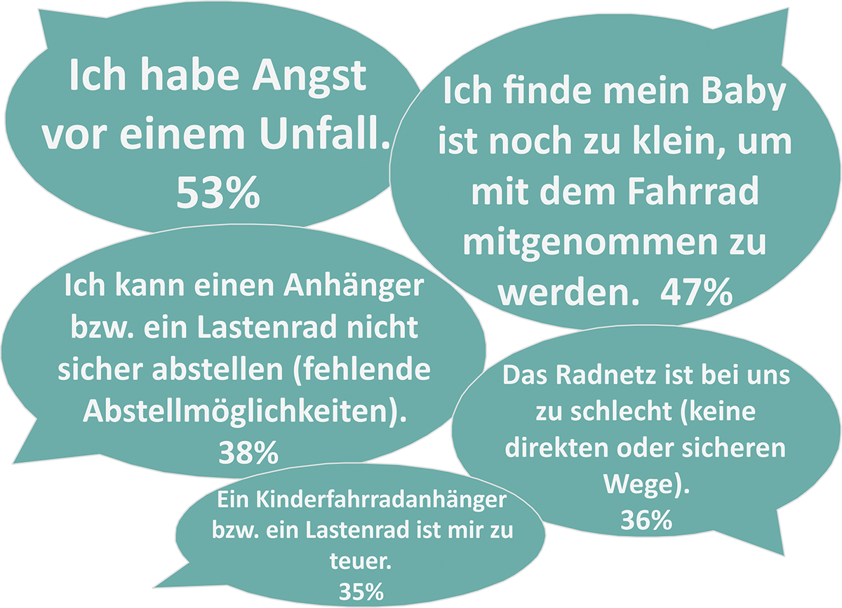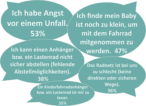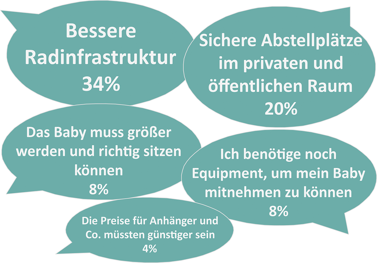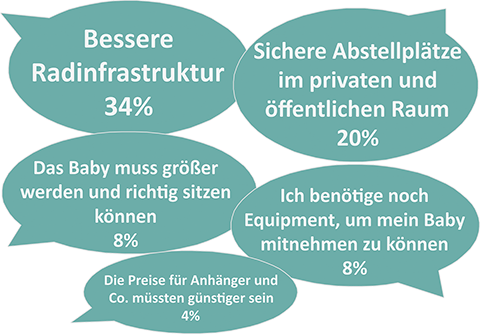 Es werden weitere Gründe genannt, die auf mangelnde Information zurückzuführen sind, z.B. »Man sollte ein Baby erst mit dem Fahrrad mitnehmen, wenn es sicher und stabil sitzen kann« [2] oder pragmatischer Natur: »Noch keine Babymatte für den Anhänger vorhanden« und »der Kinderwagen ist praktischer« [3].