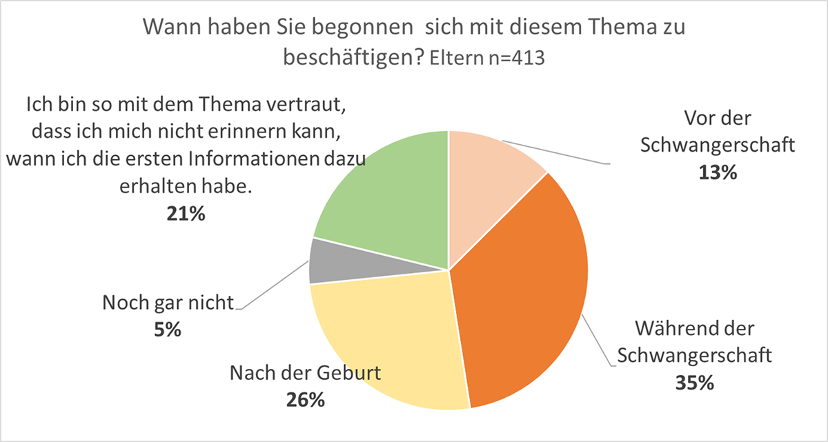 Eine Beschäftigung mit dem Thema fand bei fast der Hälfte der befragten Eltern also bereits vor der Geburt statt – ein wichtiges Indiz dafür, dass Schwangere bei der Ansprache zu diesem Thema berücksichtigt werden sollen.
