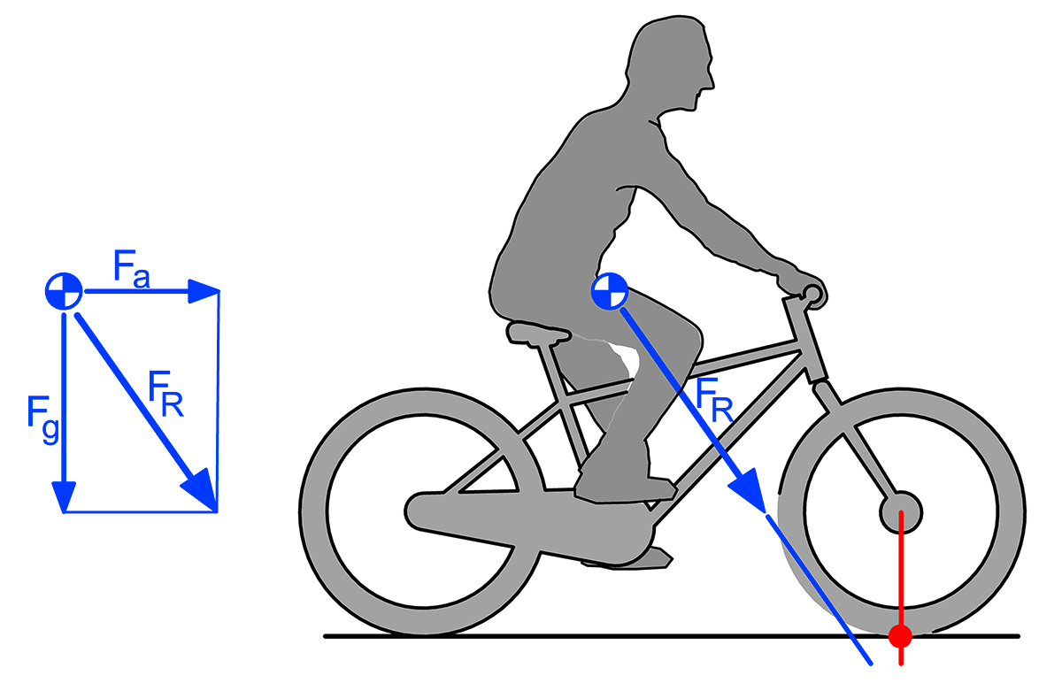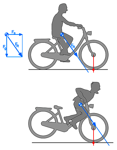 Um den vorzeitigen Überschlag zu vermeiden, ist es also notwendig, dass der Fahrer seine relative Position beibehält, indem er sich am Lenker beidseitig gleichmäßig abstützt (Bild 2). Dabei können Kräfte von mehreren hundert Newton auftreten – auch bei niedrigen Geschwindigkeiten! Bei starken Bremsmanövern übernehmen Arme/Oberkörper damit die Funktion des Fahrradrahmens. Die zur Verfügung stehende Reaktionszeit ist allerdings derartig gering, dass dem Fahrer keine Zeit bleibt, die Körperspannung erst aufzubauen. Es ist deswegen sinnvoll, dass seine Arme schon vorgespannt sind: Mit einer geneigten Sitzposition stützt er einen Teil seines Eigengewichts aktiv auf dem Lenker ab.