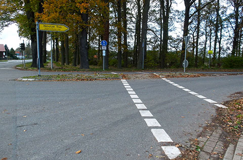 Die beschriebenen Gefahren sind recht häufig, insbesonders im Herbst und Winter. Die entsprechende Wegführung in Deutschland nennt sich: Radweg. Überflüssige Schlenker, aufgebrochene zu dünne Fahrbahndecke, Verunreinigungen jeglicher Art, Knicke und Absätze, Wechsel des Oberfläche, Moosbewuchs, Wegführung unter Bäumen (Pflege unbekannt) usw. – diese Fallen sind üblich und werden immer wieder neu geplant und ausgeführt.