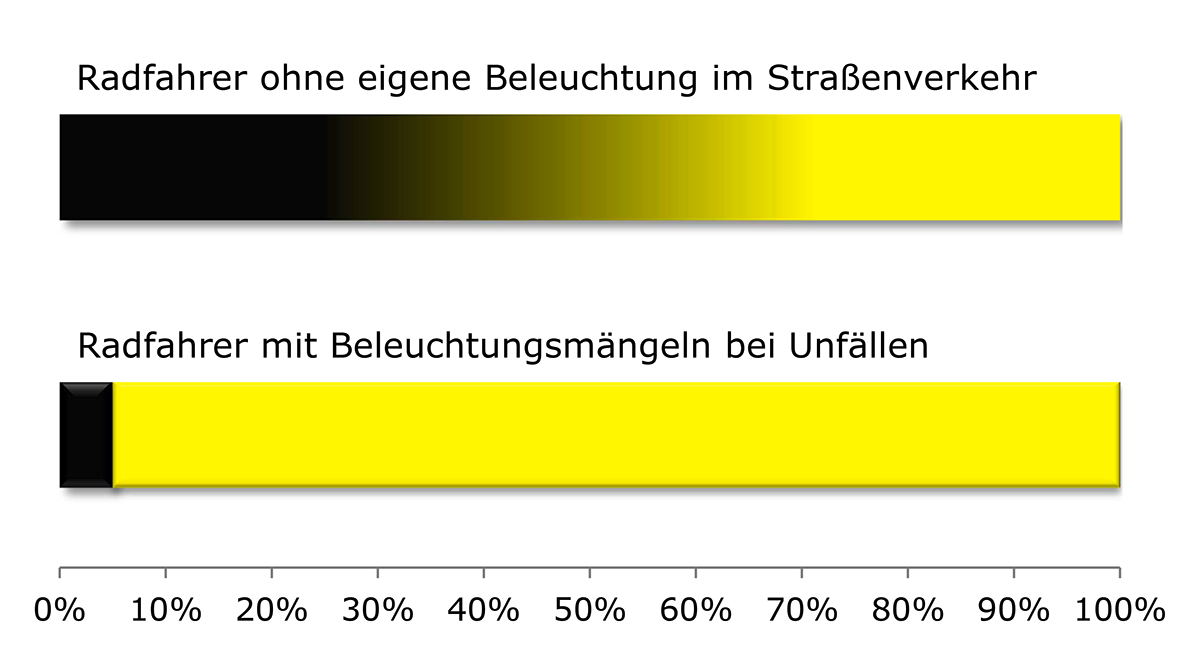 Überhaupt ist auch die Wirksamkeit aktiver Fahrradbeleuchtung zur Verhinderung von Unfällen umstritten. Eine Untersuchung aus Dänemark (Proceedings of the international velo-city'89 conference, p. 216) zeigte schon vor fast 30 Jahren, dass Radfahrer mit Beleuchtung (in Dänemark) häufiger in Unfälle verwickelt wurden. Ähnliches gibt auch die offizielle deutsche Unfallstatistik her: Im Jahr 2016 wurde 245 Radfahrern vorgeworfen, unfallursächlich ohne ausreichende Beleuchtung gefahren zu sein. Bei 472 Radfahrern trugen technische Beleuchtungsmängel zu Unfällen bei. Insgesamt wurden 3.772 Radfahrer bei Dämmerung und 10.401 bei Dunkelheit verletzt. Geht man davon aus, dass alle Unfälle, bei denen Beleuchtungsmängel ursächlich waren, bei Dämmerung und Dunkelheit geschehen sind und dass bei diesen Unfällen in der Regel nur ein Radfahrer verletzt wurde, dann traten Beleuchtungsmängel an Fahrrädern nur bei 717 von 14.173 relevanten Unfällen, also bei fünf Prozent als Ursache auf. Nun fahren weit mehr als fünf Prozent der Radfahrer bei Dämmerung und Dunkelheit ohne eigene Beleuchtung, wie aus Zählungen und den Wehklagen von Polizei und Politik hinreichend hervorgeht. Wären beispielsweise 30 Prozent der Radfahrer mit Beleuchtungsmängeln unterwegs und hätte das gar keinen Einfluss auf die Unfallhäufigkeit, müssten auch 30 Prozent der Unfallbeteiligten durch Beleuchtungsmängel auffallen. Wirkt die fehlende eigene Beleuchtung Gefahr erhöhend, müssten sogar mehr als 30 Prozent in den Unfällen auftauchen. Dass es tatsächlich höchstens fünf Prozent sind, gibt zu denken. Fahren vielleicht Radfahrer ohne eigenes Licht in dem Wissen, dass sie übersehen werden können, vorsichtiger und defensiver? Wahrgenommen werden Sie trotzdem regelmäßig, wie jeder Autofahrer anschaulich bestätigt, der sich darüber aufregt, dass er wieder einen »Radler ohne Licht« gesehen hat.