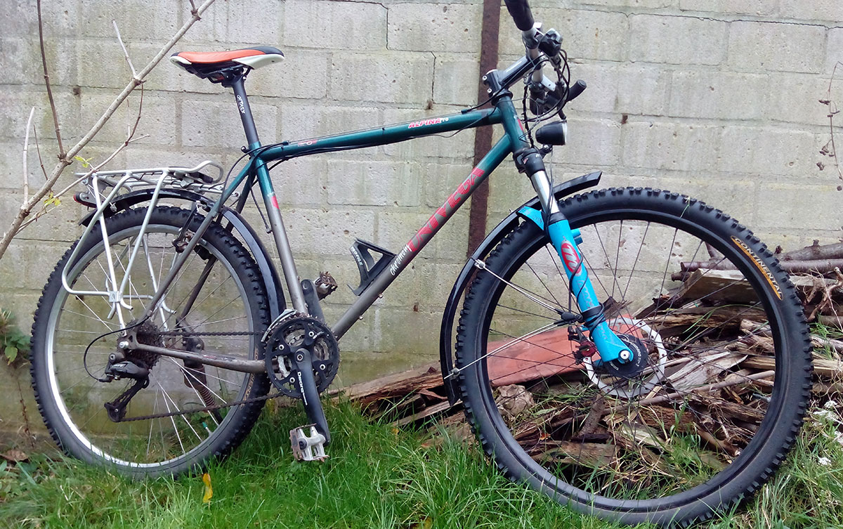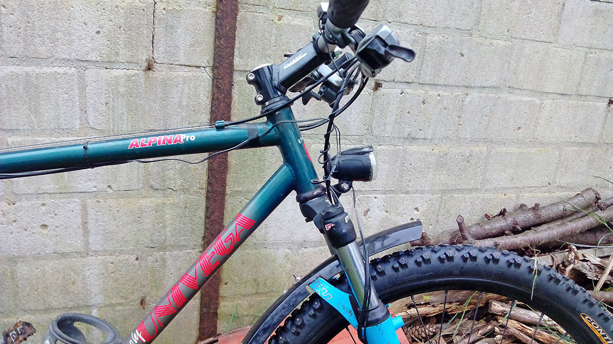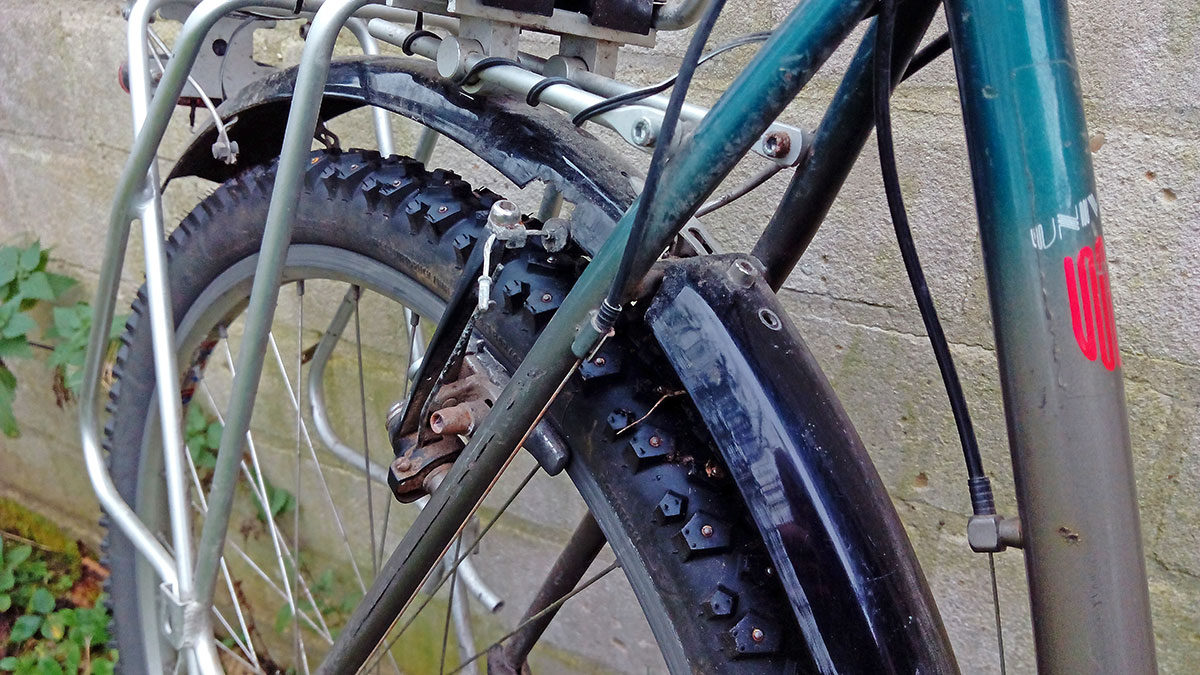 Aus Platzgründen steht dieses Rad im Moment vor dem Haus, vom Küchenfenster aus jederzeit zu sehen. Das macht Lust darauf, es auch zu fahren. Den stählernen Alpina Pro Mountainbike-Rahmen habe ich sehr gerne für seine ursprüngliche Bestimmung eingesetzt. Seit ein paar Jahren ist aber ein spezialisiertes Winterrad daraus geworden, was wegen seiner Spikereifen nur auf Schnee und Eis sinnvoll einzusetzen ist. Natürlich ist es Luxus, ein Rad nur für diese hierzulande eher seltenen Bedingungen vorzuhalten: Im vergangenen Winter habe ich es genau drei Mal benötigt. Man könnte auch an jedem x-beliebigen Alltagsrad im Winter einfach Spikereifen montieren. Neben der Bequemlichkeit, die Reifen nicht nach Jahreszeit oder Witterung wechseln zu müssen, sind mir meine anderen Räder für den Wintereinsatz aber schlicht zu schade. Dauernde Nässe und vor allem das Streusalz nagen stark am Rad. Zudem setzt sich der bei einem Alltagsrad auf Nässe optimierte Zwischenraum zwischen Reifen und Schutzblech oft mit anhaftendem Schnee zu.