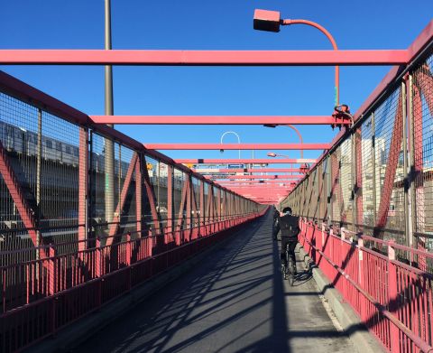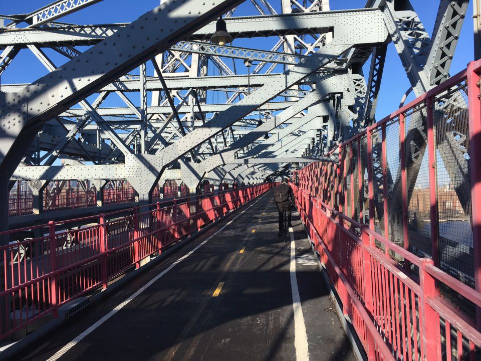 Die Williamsburg Bridge ist auf meinem relativ flachen Radweg der einzige steile Teil. 264-mal über die Williamsburg Bridge entspricht einer Besteigung des Mount Everest (und ja, dies wurde letztes Jahr von einem Verrückten an einem Tag unternommen). Das Tolle an der Williamsburg Bridge ist die Abwesenheit von Verkehr, Kreuzungen und Schlaglöchern und so werden die Minuten auf der Brücke immer zur Meditationsphase. Ein Übriges trägt die atemberaubende Aussicht auf die oft in Wolken gehüllten Hochhäuser in Midtown dazu bei.