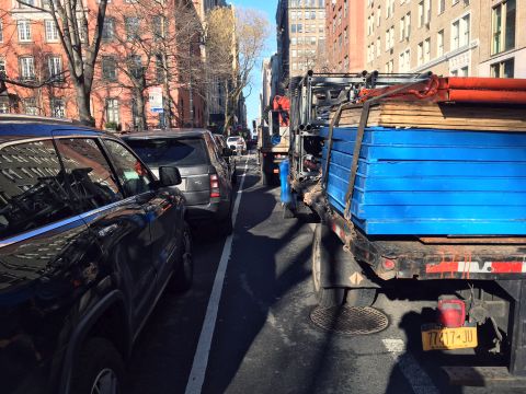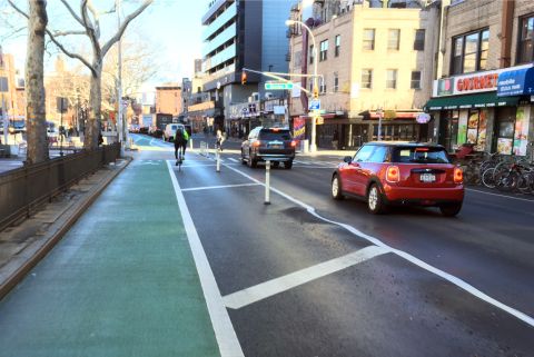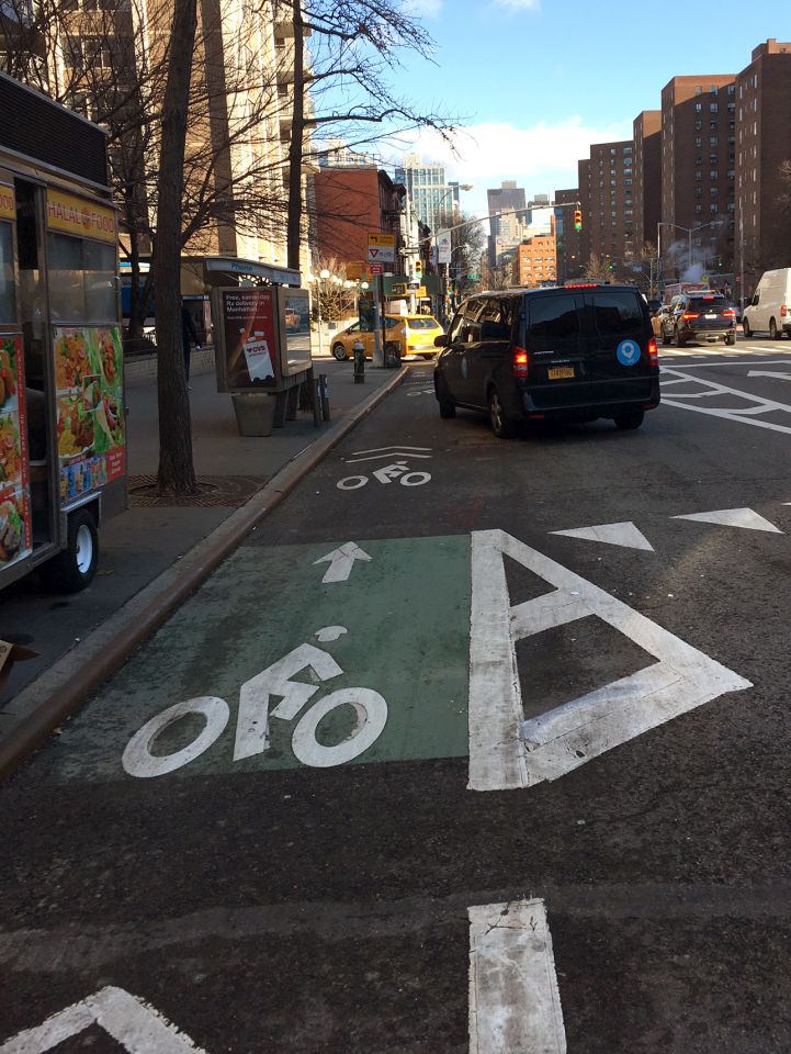 Gerade im Sommer gibt es viele Fahrradpendler und die Stadt hat langsam nachgezogen: Auf der 1st Avenue nach Norden sowie der 2nd Avenue nach Süden gibt es seit Kurzem einen vom Hauptverkehr durch parkende Autos abgetrennten Radweg. Weitere Radwege dieser Art gibt es auf einer kleinen Anzahl anderer Avenues - das sind die Straßen in Manhattan, die in Nord-Süd-Richtung verlaufen sowie an den beiden Rändern Manhattans am Wasser. Die meisten Radwege in New York sind jedoch lediglich farbige Markierungen auf dem Asphalt und Räder und Autos teilen sich den gleichen Platz. Der geschützte Radweg auf der Westseite hat letztes Jahr traurige Weltberühmtheit erreicht, als dieser Ziel eines Anschlags wurde bei dem acht Menschen starben. Seither stehen an allen Zugängen des Radwegs schwere Betonsperren, die es Kraftfahrzeugen unmöglich machen auf den Radweg zu gelangen.