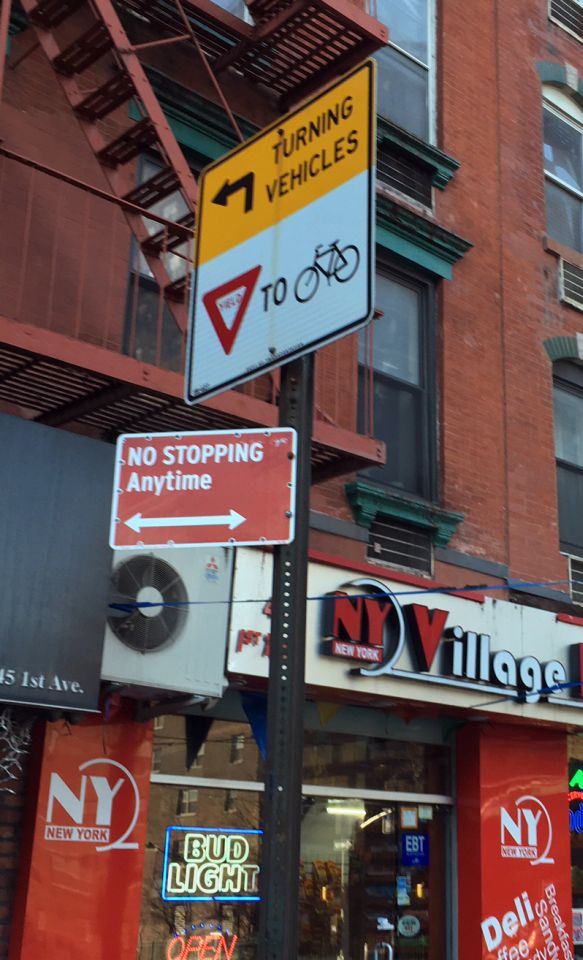 Weit schlimmer wiegt das Abbiegeproblem. Manhattan ist wie ein Schachbrett aufgeteilt und nach jedem zweiten Block biegen die Autofahrer der 1st Avenue quer über den Radweg nach links ab. Soweit, so bekannt. An einigen Stellen hat New York das Problem mit einer Linksabbiegeampel für Autofahrer gelöst, wobei zuerst die Fahrräder geradeaus fahren und dann die Autofahrer direkt danach nach links abbiegen können. An den meisten Stellen ist dies jedoch nicht der Fall, und winzige Schilder weisen stattdessen darauf hin, dass Fahrradfahrer Vorfahrt haben. Beachtet oder gar von der Polizei kontrolliert wird die Vorfahrtregel jedoch nicht. Ganz im Gegenteil, die Polizei selbst nimmt mir des Öfteren die Vorfahrt und scheint die Vorfahrtsregel auch selbst gar nicht zu kennen. An meinem ersten Tag in New York wurde ich denn auch direkt von einem Linksabbieger angefahren, allerdings nur mit Schrittgeschwindigkeit und ohne Schaden. Ich habe daraus gelernt Linksabbieger schon im Vorfeld zu vermeiden und sie rechts auf der Autospur zu überholen. Dennoch sehe ich jeden Morgen mindestens 10 ziemlich knappe Situationen bei anderen Radlerinnen und Radlern.