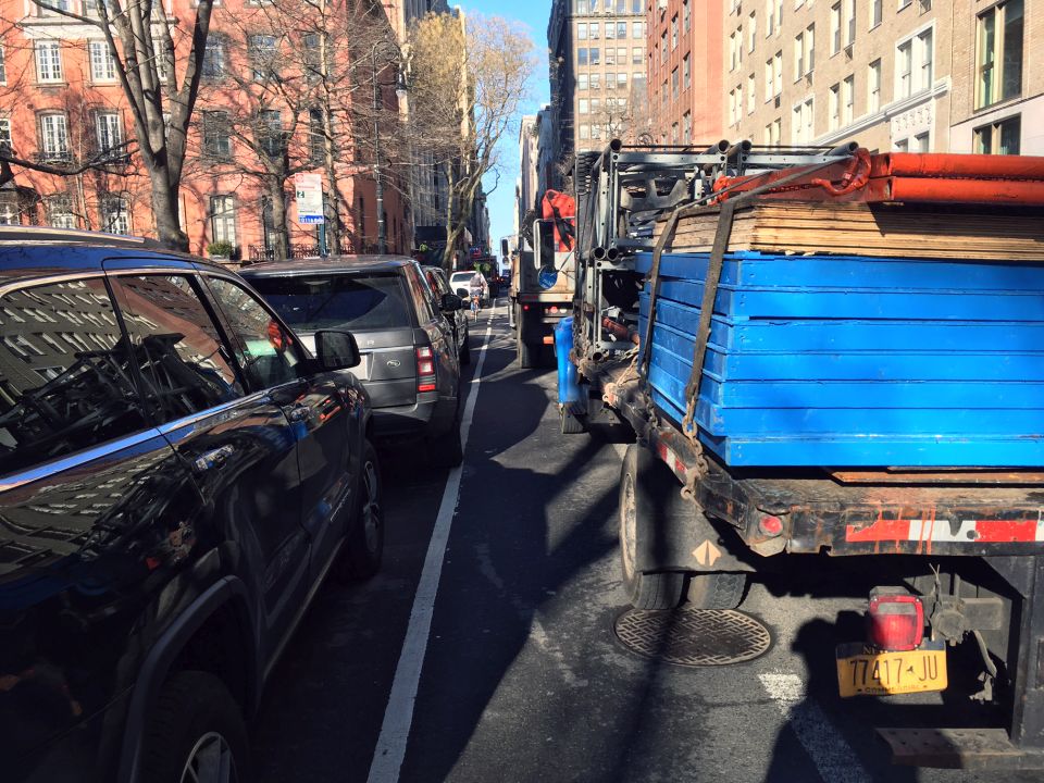 Doch zurück zum Radweg auf der 1st Avenue, dem Hauptteil meiner morgendlichen Strecke. Zwar ist das Konzept gut, doch es hapert an der Ausführung. Die Qualität des Belages entspricht dem Manhattandurchschnitt: Jede Straße ist ein über mehr als hundert Jahre entstandenes Flickwerk. Oft wird etwas aufgebohrt, zugeschüttet, verändert. Und das hinterlässt Schlaglöcher, Spurrillen, und andere unvorhersehbare Gefahren. Zum Beispiel die Dampfschlote: Unter ganz Manhattan verläuft ein Dampfnetzwerk, das an vielerlei Stellen so undicht ist, dass große Mengen an heißem Dampf austreten. Geflickt wird das Netzwerk nicht - stattdessen stehen in Manhattan immer mal wieder zwei Meter hohe dampfende Verkehrshütchen auf der Straße. Oft auch mitten im Hauptverkehr. Auch der Boden sinkt manchmal einfach ab. Auf dem Fahrradstreifen neben meinem Büro gab es urplötzlich ein Loch, das sicherlich über 20 cm in die Tiefe geht. Doch es ist klar, dass der Radweg nicht besser sein kann als der Rest der bröckelnden Infrastruktur in Manhattan. So bleibt das Radeln immer spannend, besonders mit meinen kleinen 16-Zoll-Rädern.