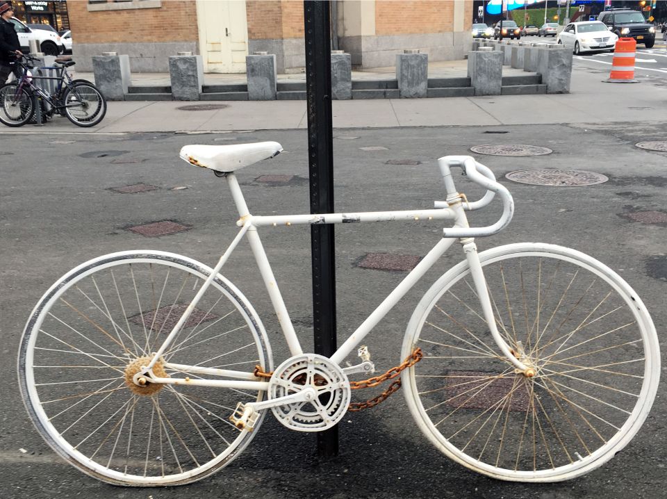 Glücklicherweise bin ich nicht der einzige Fahrradfreund in der Stadt. Transportation Alternatives, quasi New Yorks »Volksentscheid Fahrrad«, setzt sich für Fahrradverkehr ein. Der Verein wurde 1973 gegründet und umfasst immerhin 100.000 aktive Mitglieder und Unterstützer. Und politischer Druck ist dringend nötig: Über 20 Fahrradfahrer starben alleine 2017 durch Unfälle mit Autos. Selbst wenn die Schuldfrage klar ist werden diese Fälle oft nicht verfolgt oder nur mit minimalen Strafen belegt. Selbst ein Fahrer mit Vorstrafen, der zum Tatzeitpunkt vermutlich betrunken jemanden auf dem Radweg überfahren hatte und dann Fahrerflucht beging, wurde nicht verfolgt. Stattdessen reagiert die Polizei oft mit einer verstärkten Kontrolle von Fahrrädern in den Tagen nach dem Unfall. Neben Transportation Alternatives gibt es eine Initiative von Menschen, die an Orten tödlicher Fahrradunfälle sogenannte Geisterräder (»ghost bikes«) aufstellen. Das sind ausgediente Fahrräder, die komplett weiß gesprayt werden und so dauerhaft an den Unfall erinnern, oft auch mit einer Plakette. In den letzten 15 Jahren wurden über 150 Geisterräder auf den Straßen New Yorks ausgesetzt.