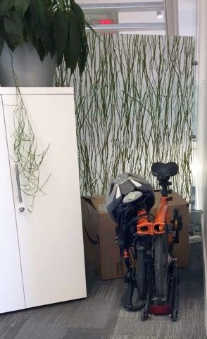 Ich rolle das Rad aus dem Aufzug neben meinen Schreibtisch.